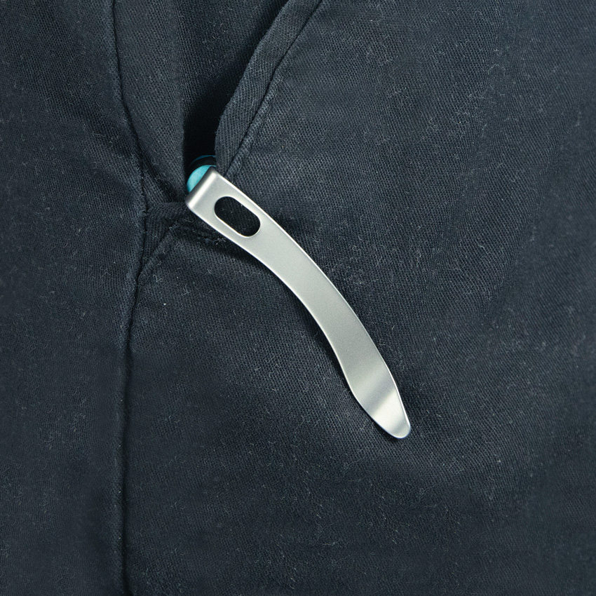 4.5″ (11.43cm) closed. 3.5″ (8.89cm) stonewash finish 14C28N Sandvik stainless blade. Tiffany blue G10 handle. Thumb stud. Lanyard hole. Pocket clip. Boxed.