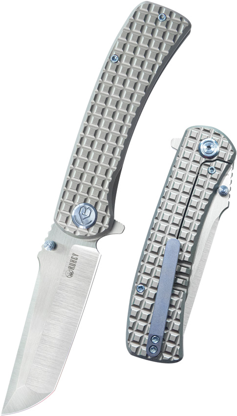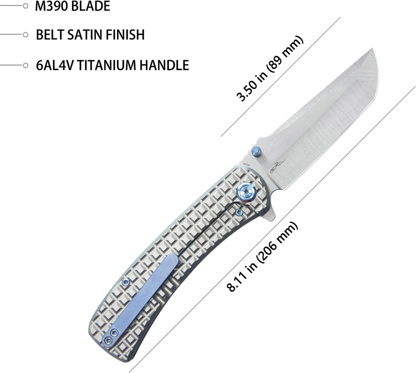 4.63″ (11.76cm) closed. 3.6″ (9.14cm) satin finish Bohler M390 stainless tanto blade. Gray textured titanium handle. Thumb stud. Extended tang. Pocket clip. Black nylon zippered storage case. Boxed.