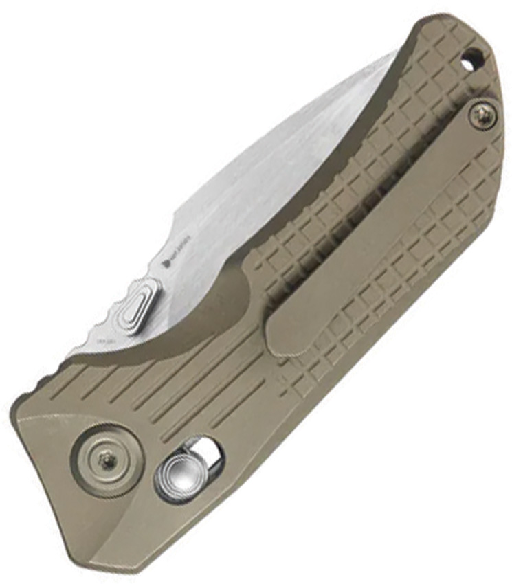 3.5″ (8.89cm) closed. 2.38″ (6.05cm) satin finish CPM S90V stainless drop point blade. Bronze frag pattern titanium handle. Thumb disk. Lanyard hole. Pocket clip. Boxed.