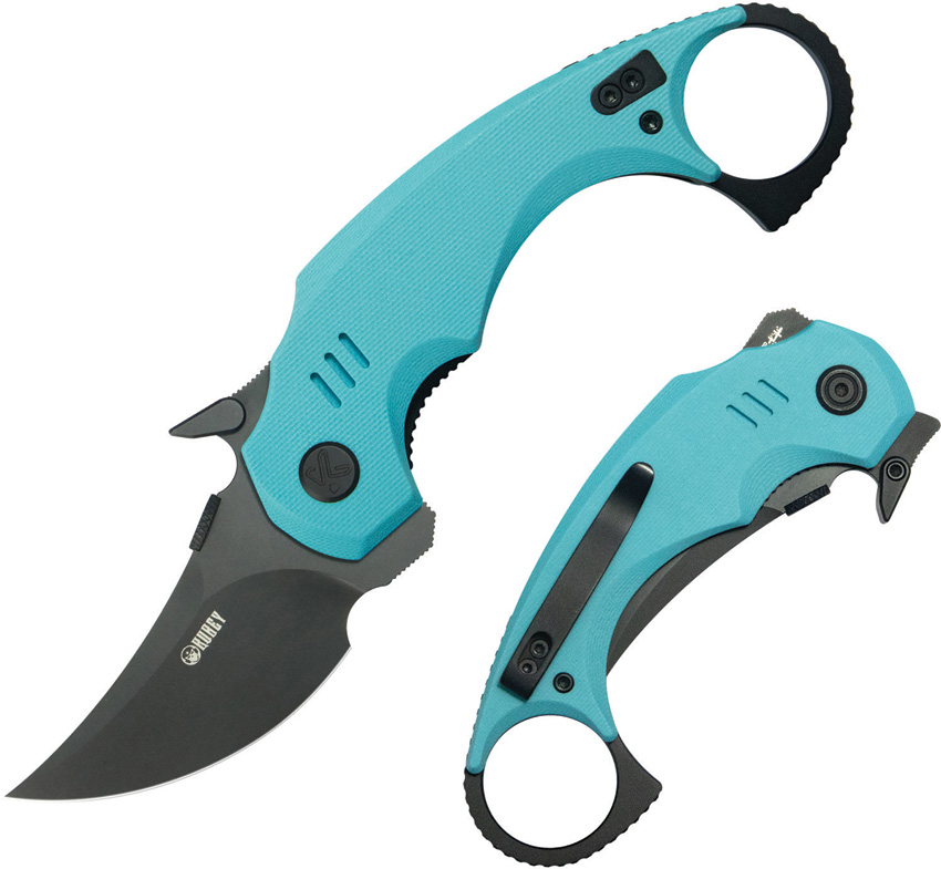 4.88″ (12.4cm) closed. 2.5″ (6.35cm) black stonewash finish 14C28N Sandvik stainless karambit blade. Tiffany blue G10 handle. Thumb disk. Extended tang. Finger ring. Pocket clip. Boxed.
