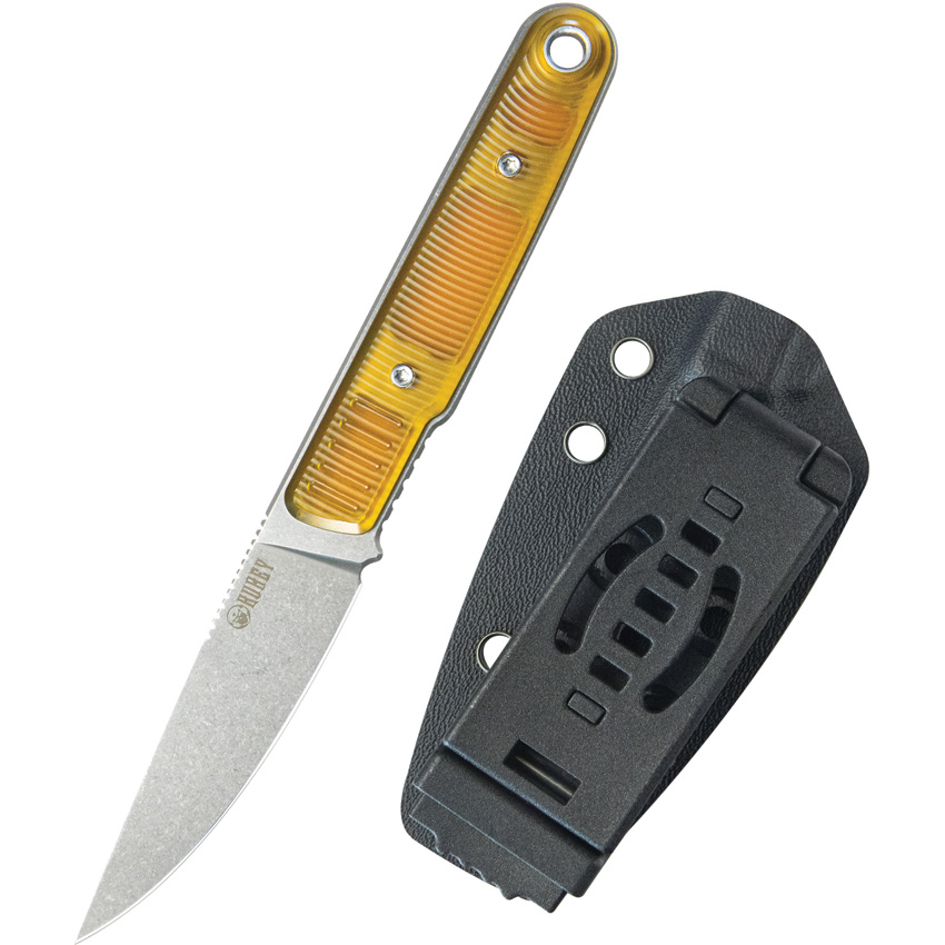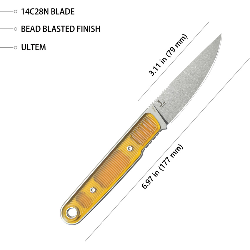 7″ (17.78cm) overall. 3.13″ (7.95cm) stonewash finish 14C28N Sandvik stainless blade. Ultem handle. Full tang. Lanyard hole. Black Kydex belt sheath. Boxed.