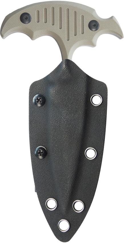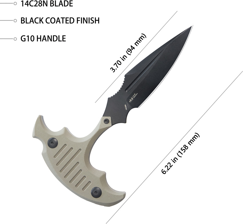 6.25″ (15.88cm) overall. 3.7″ (9.4cm) black stonewash finish false edge 14C28N Sandvik stainless dagger blade. Tan G10 handle. Full tang. Black Kydex belt sheath. Boxed.