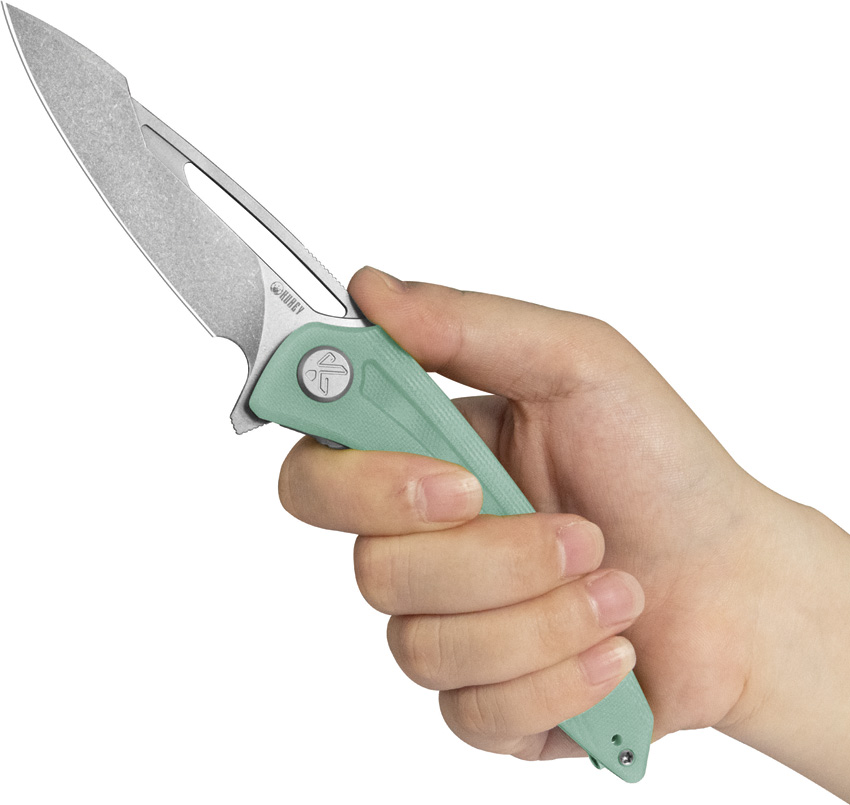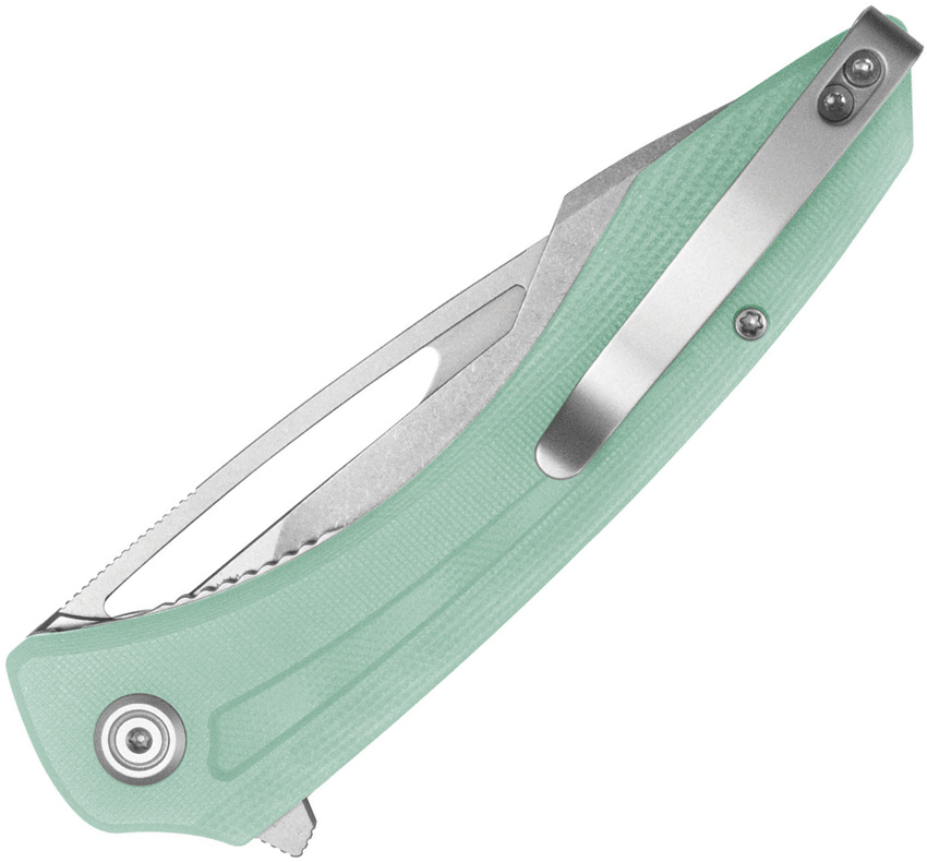 4.5″ (11.43cm) closed. 3.5″ (8.89cm) stonewash finish 14C28N Sandvik stainless blade. Jade G10 handle. Thumb pull. Pocket clip. Extended tang. Boxed.