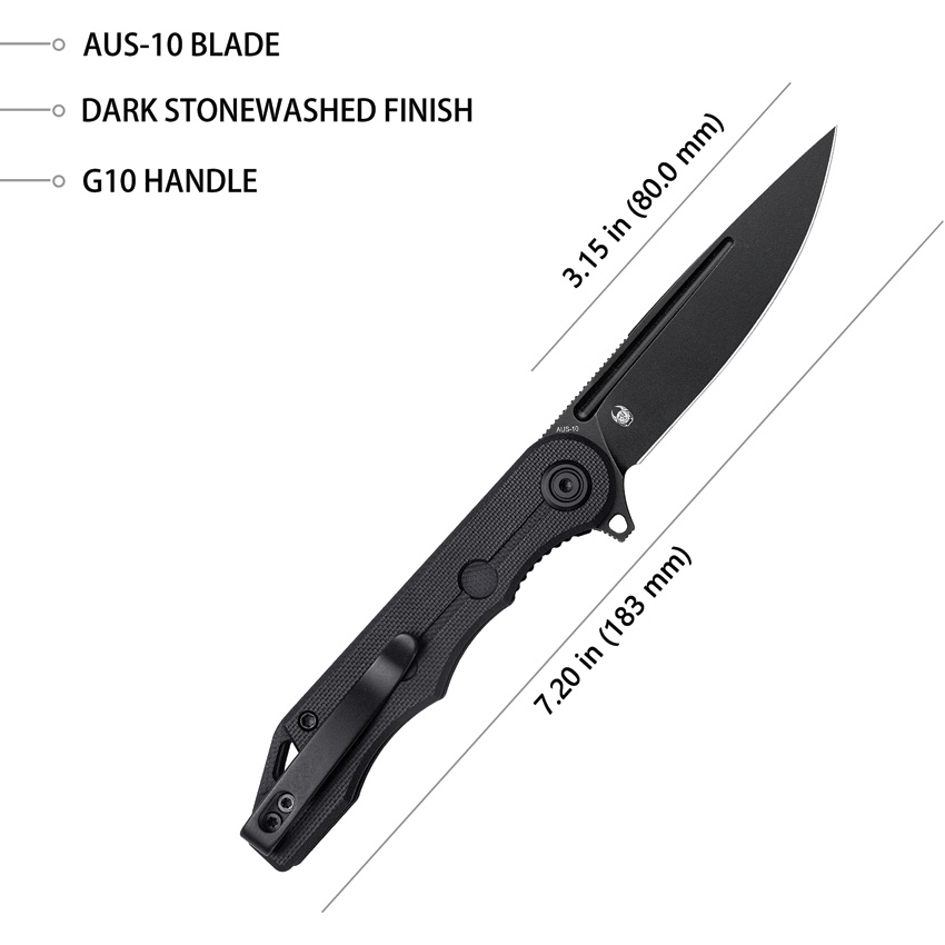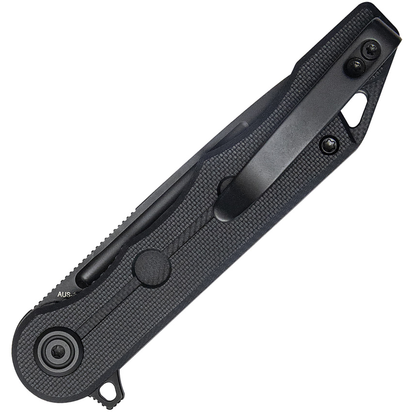 4″ (10.16cm) closed. 3.13″ (7.95cm) black stonewash finish AUS-10A stainless blade. Black G10 handle. Extended tang. Lanyard hole. Pocket clip. Boxed.
