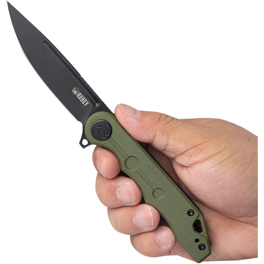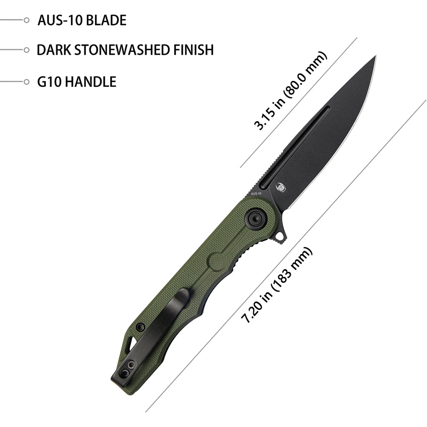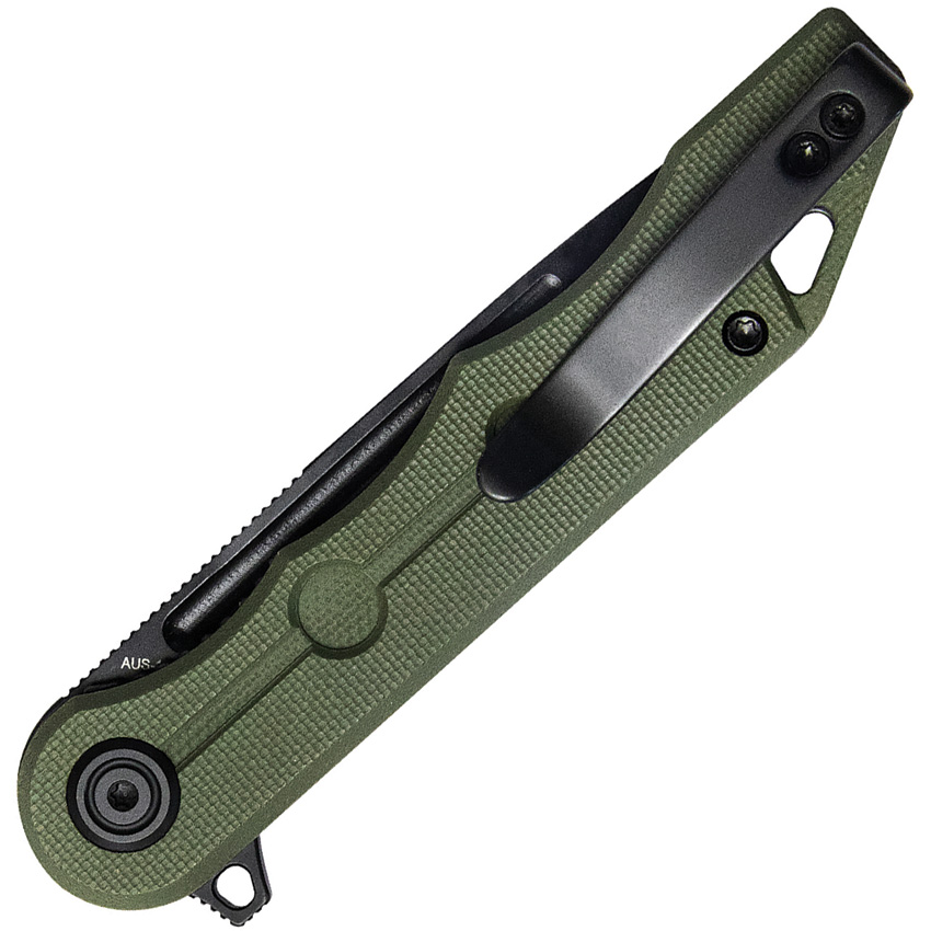 4″ (10.16cm) closed. 3.13″ (7.95cm) black stonewash finish AUS-10A stainless blade. OD green G10 handle. Extended tang. Lanyard hole. Pocket clip. Boxed.