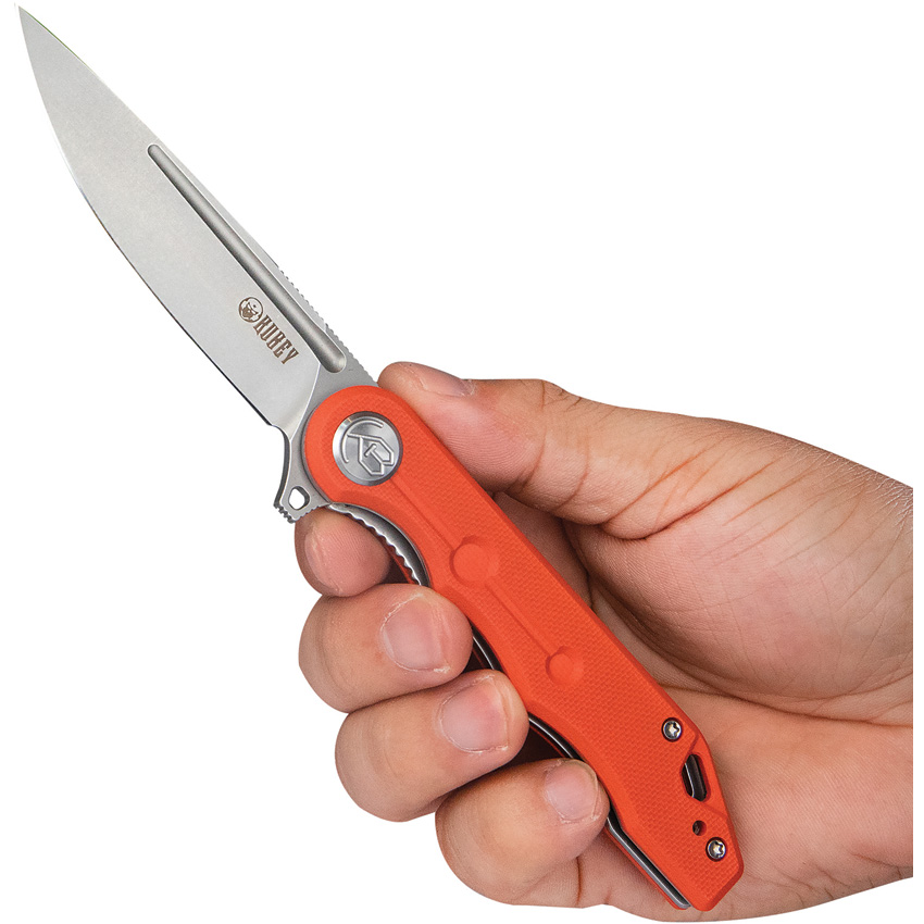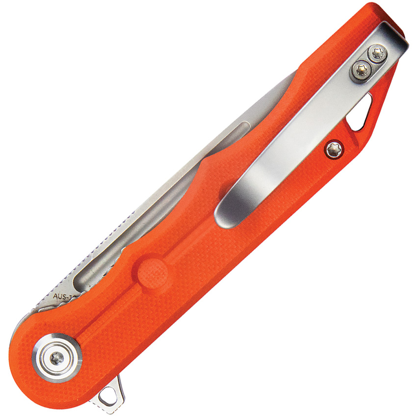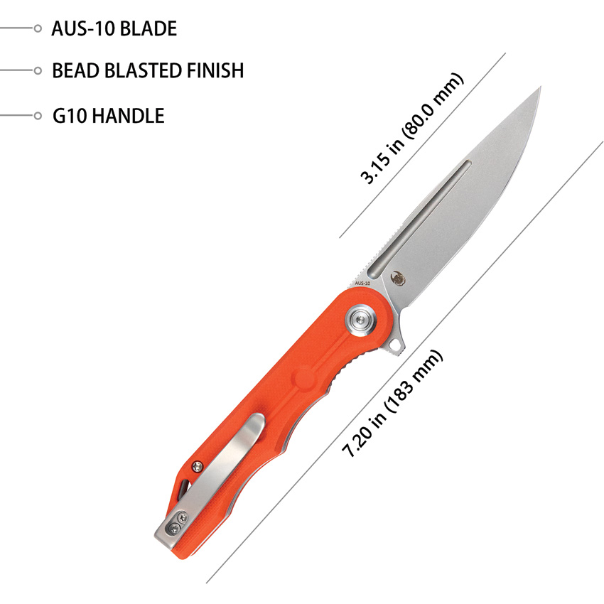 4″ (10.16cm) closed. 3.13″ (7.95cm) bead blast finish AUS-10A stainless blade. Orange G10 handle. Extended tang. Lanyard hole. Pocket clip. Boxed.