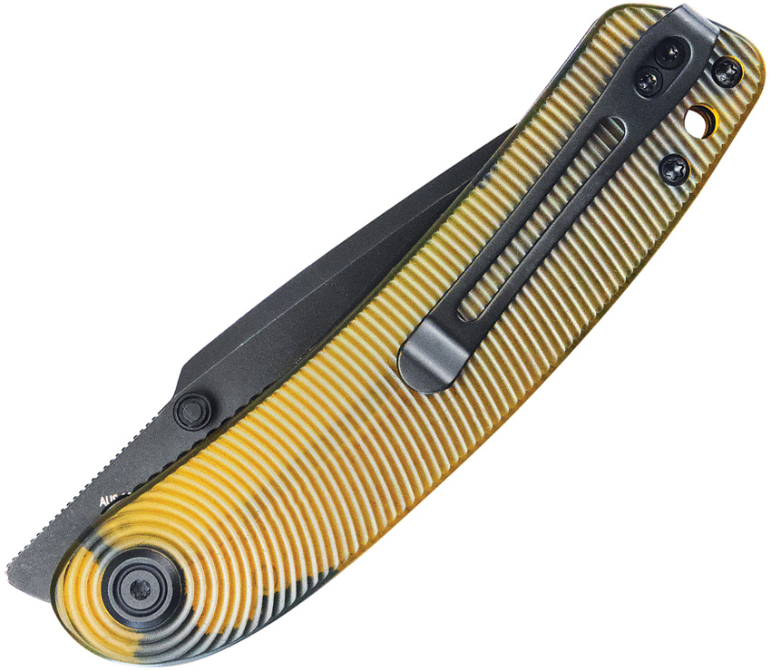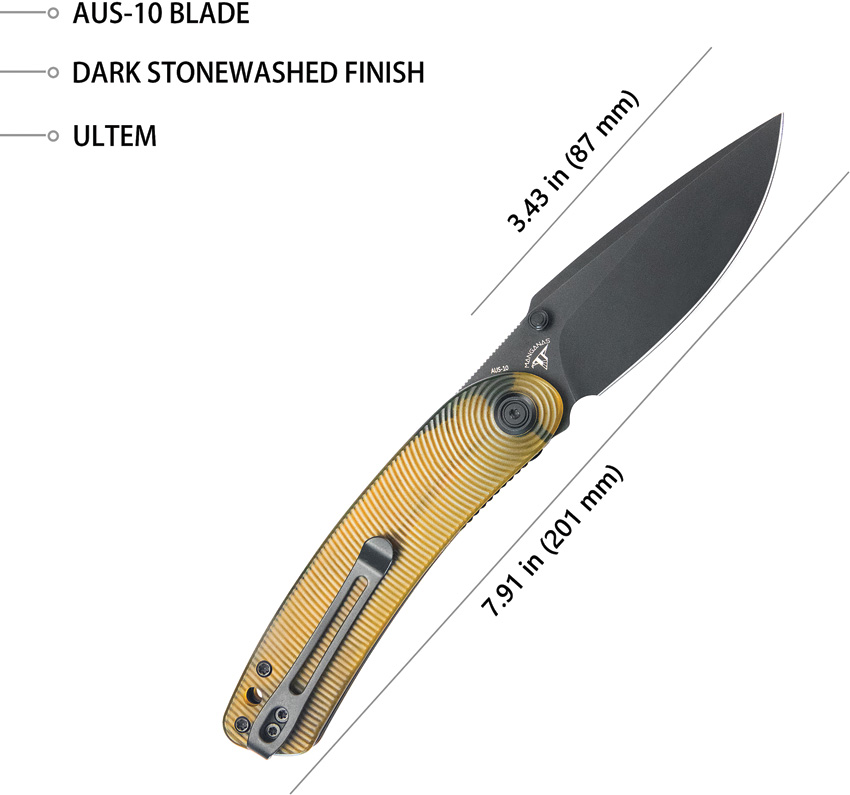 4.5″ (11.43cm) closed. 3.5″ (8.89cm) black stonewash finish AUS-10A stainless blade. Ultem handle. Extended tang. Lanyard hole. Pocket clip. Thumb stud. Boxed.