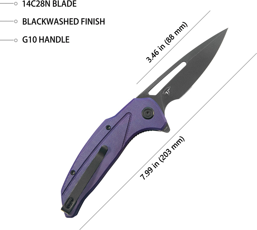 4.5″ (11.43cm) closed. 3.5″ (8.89cm) black stonewash finish 14C28N Sandvik stainless blade. Purple G10 handle. Thumb pull. Extended tang. Pocket clip. Boxed.