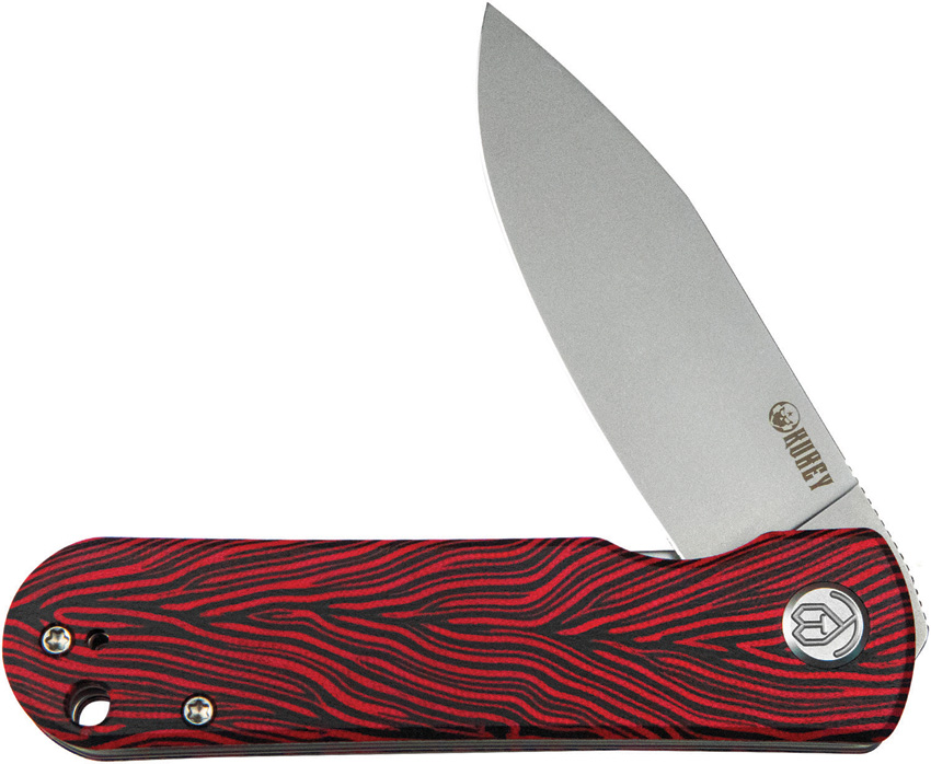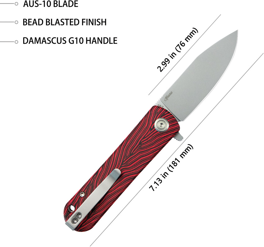 4.5″ (11.43cm) closed. 3.5″ (8.89cm) stonewash finish AUS-10A stainless clip point blade. Red Damascus pattern G10 handle. Extended tang. Lanyard hole. Pocket clip. Boxed.