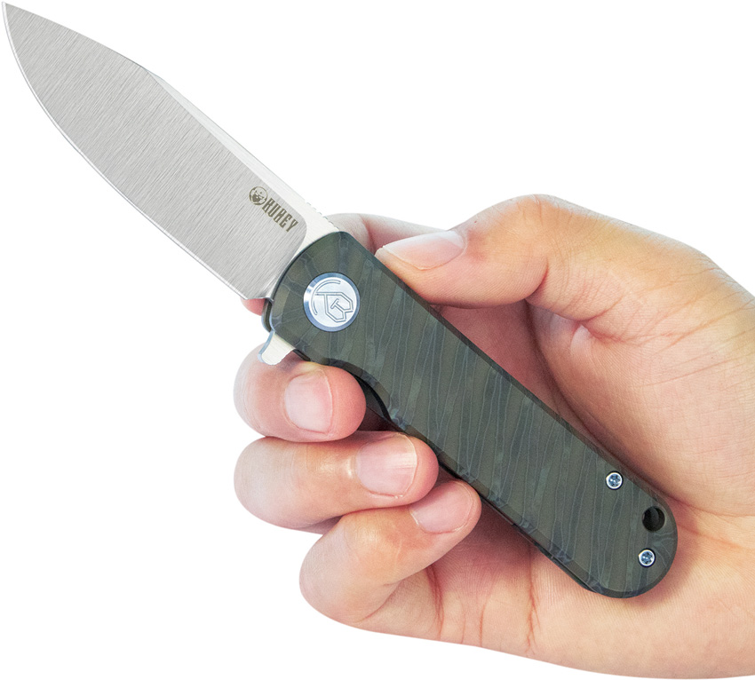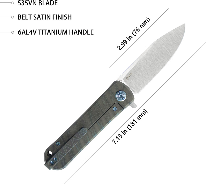 4.13″ (10.49cm) closed. 3″ (7.62cm) satin finish S35VN stainless blade. Flame anodized titanium handle. Extended tang. Lanyard hole. Pocket clip. Black nylon zippered storage case. Boxed.