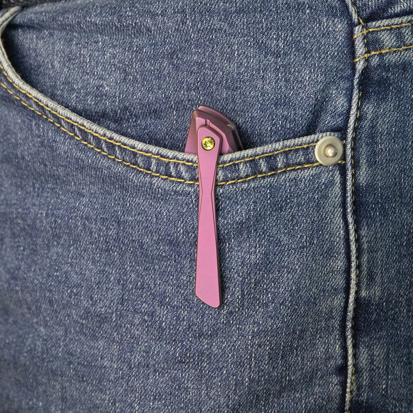 4.88″ (12.4cm) closed. 3.63″ (9.22cm) bead blast finish 14C28N Sandvik stainless blade. Purple anodized titanium handle. Extended tang. Pocket clip. Boxed.