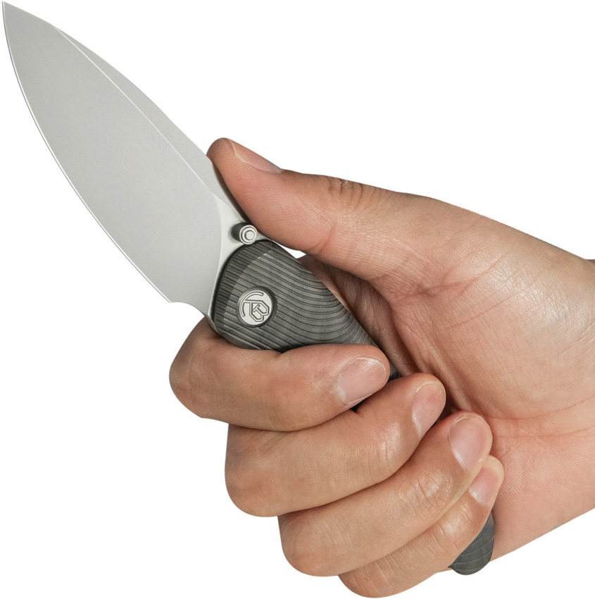 4.5″ (11.43cm) closed. 3.38″ (8.59cm) bead blast finish CPM-20CV stainless drop point blade. Flame anodized titanium handle. Extended tang. Thumb stud. Pocket clip. Boxed.