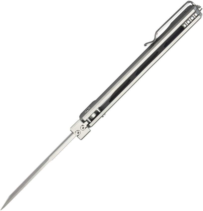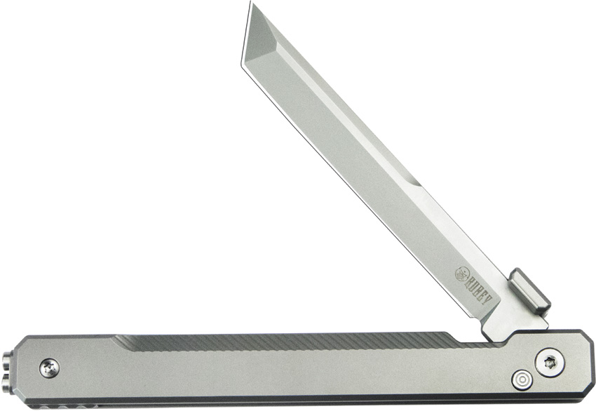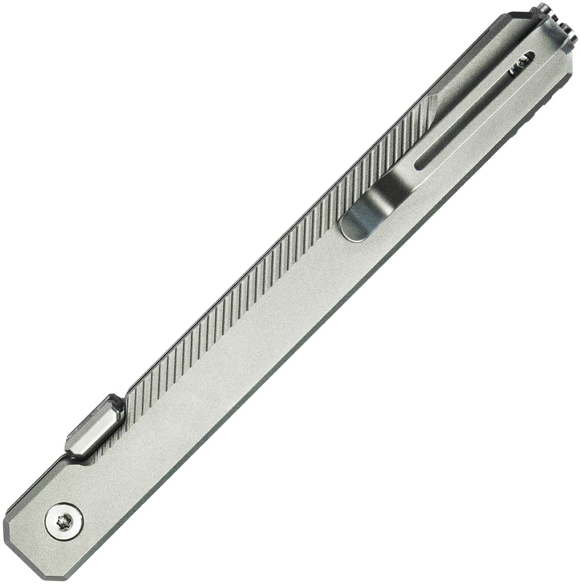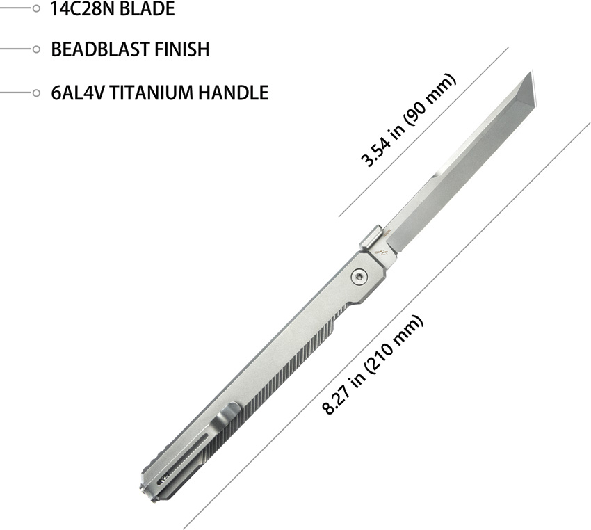 4.75″ (12.07cm) closed. 3.5″ (8.89cm) bead blast finish 14C28N Sandvik stainless tanto blade. Silver titanium handle. Thumb disk. Pocket clip. Boxed.