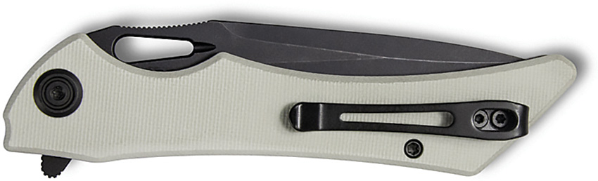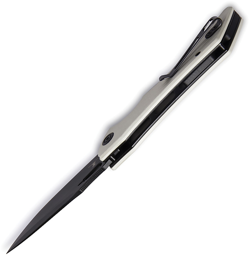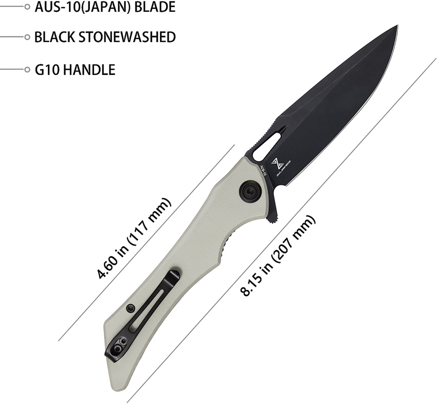 4.75″ (12.07cm) closed. 3.88″ (9.86cm) black stonewash finish AUS-10A stainless blade. Ivory G10 handle. Extended tang. Thumb pull. Pocket clip. Boxed.