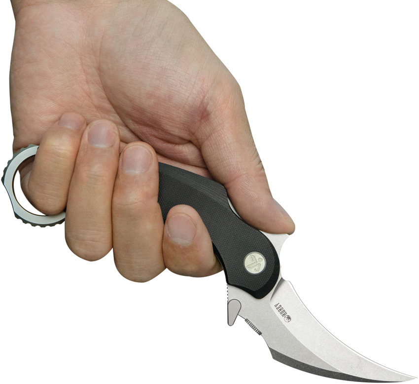 4.88″ (12.4cm) closed. 3″ (7.62cm) black finish 14C28N Sandvik stainless karambit blade. Black G10 handle. Extended tang. Finger ring. Pocket clip. Thumb disk. Boxed.