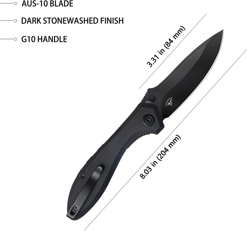 4.75″ (12.07cm) closed. 3.5″ (8.89cm) black stonewash finish AUS-10A stainless blade. Black G10 handle. Thumb stud. Extended tang. Pocket clip. Boxed.