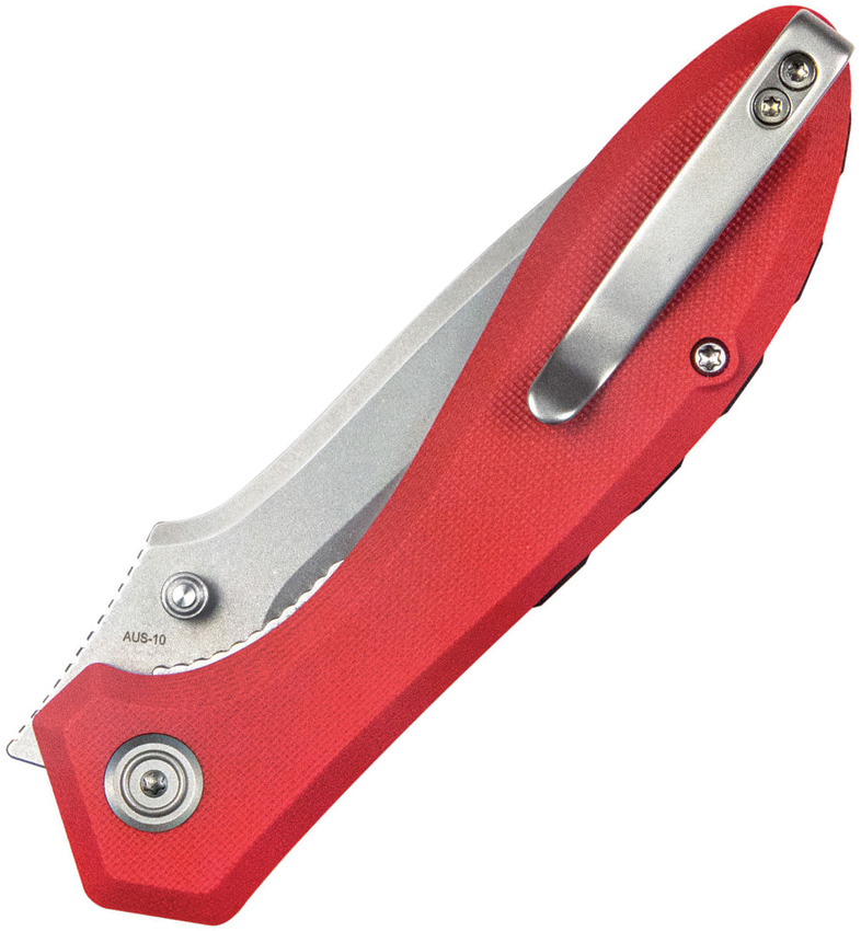 4.75″ (12.07cm) closed. 3.5″ (8.89cm) stonewash finish AUS-10A stainless blade. Red G10 handle. Thumb stud. Extended tang. Pocket clip. Boxed.