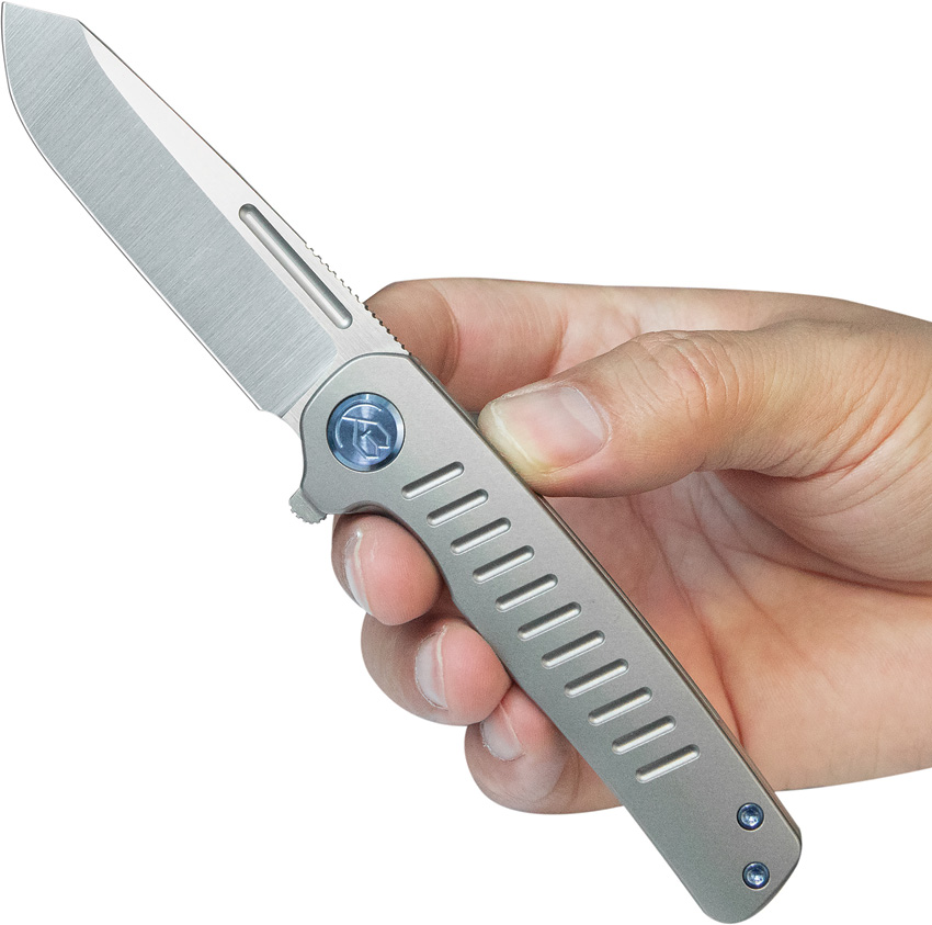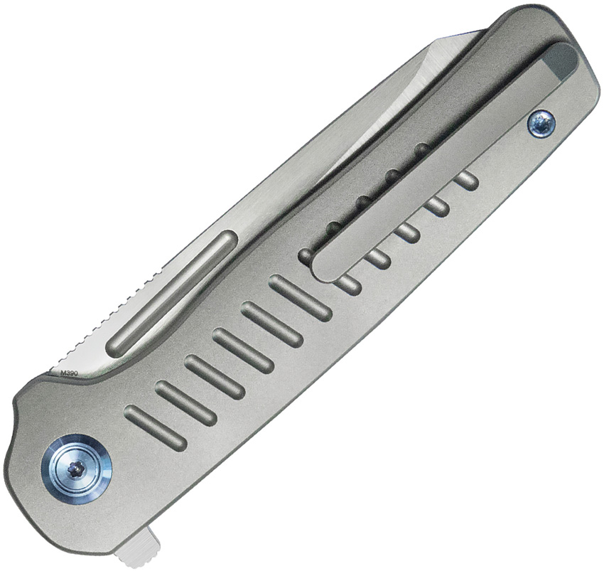 4.13″ (10.49cm) closed. 3.13″ (7.95cm) satin finish Bohler M390 stainless reverse tanto blade. Gray titanium handle. Extended tang. Pocket clip. Boxed.