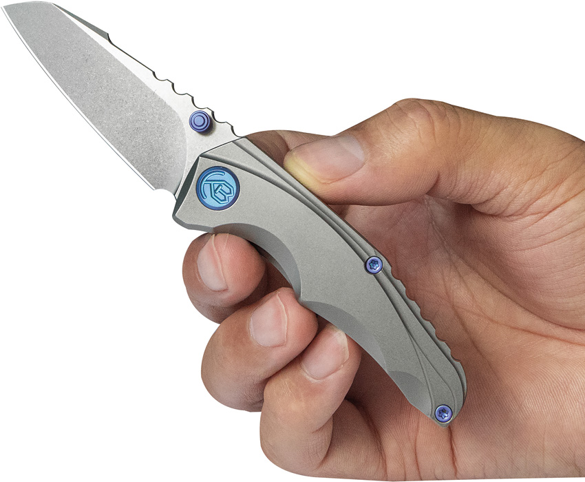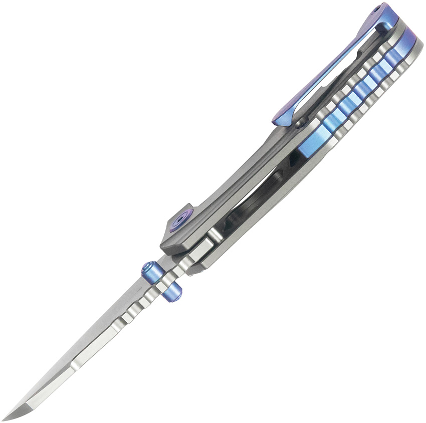 3.25″ (8.26cm) closed. 2.38″ (6.05cm) stonewash finish Bohler M390 stainless sheepsfoot blade. Gray titanium handle. Thumb stud. Pocket clip. Blue anodized accents. Boxed.