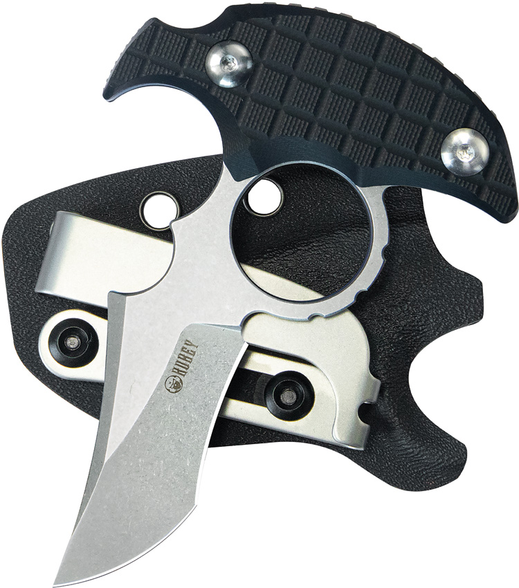 4.25″ (10.8cm) overall. 2.95″ (7.49cm) stonewash finish 14C28N Sandvik stainless blade. Black frag pattern G10 handle. Full tang. Finger ring. Black Kydex belt sheath. Boxed.