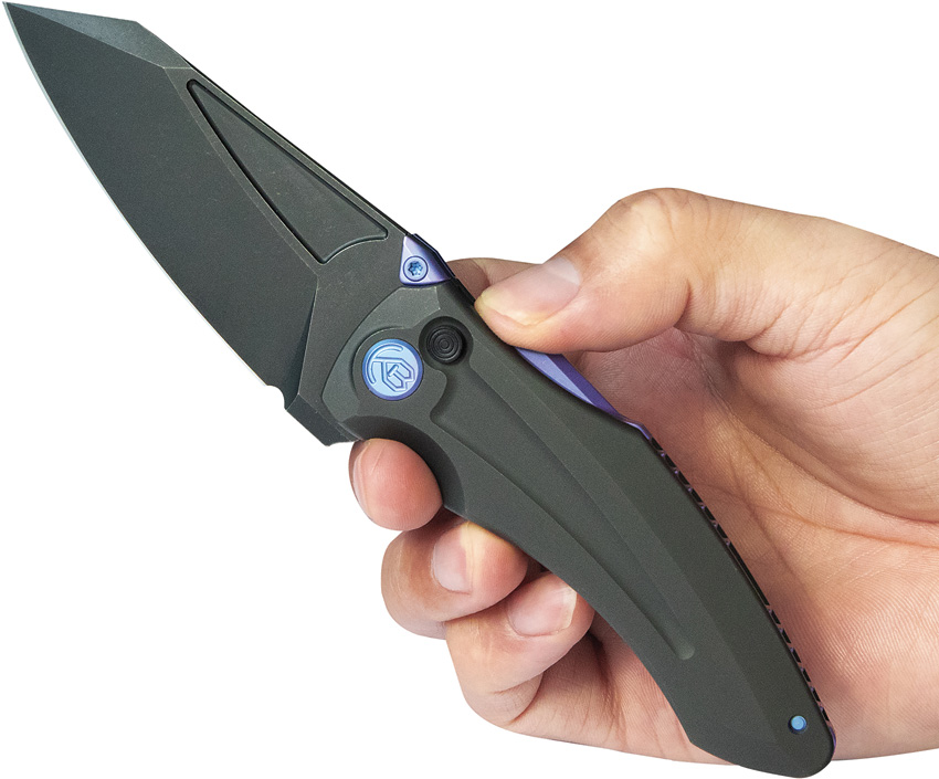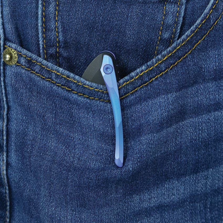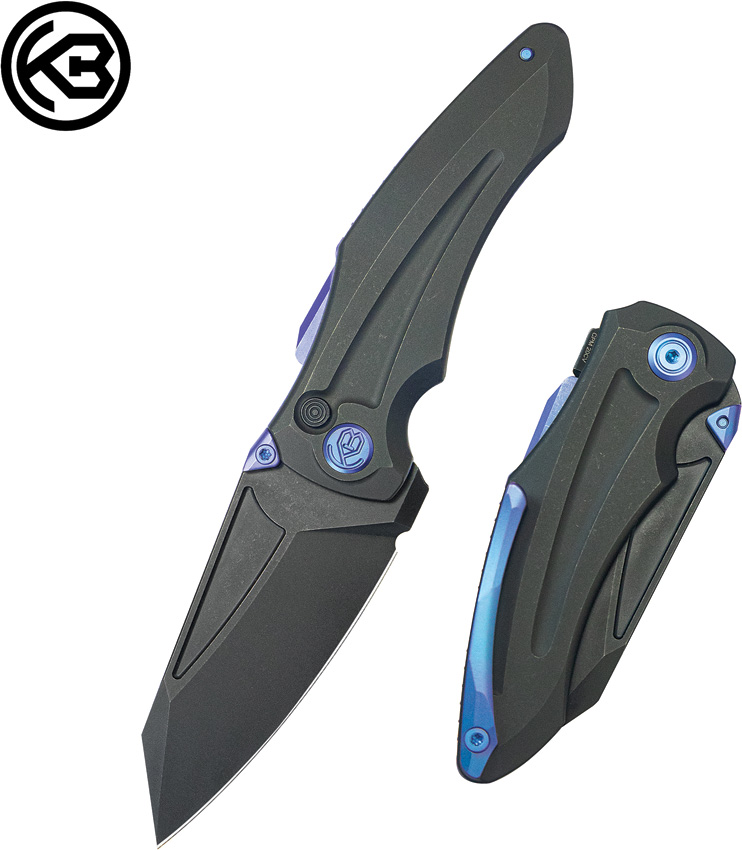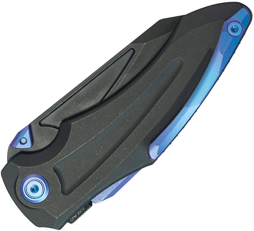 4.13″ (10.49cm) closed. 3.13″ (7.95cm) BlackWash finish CPM-20CV stainless blade. BlackWash finish titanium handle. Thumb disk. Pocket clip. Blue anodized accents. Boxed.