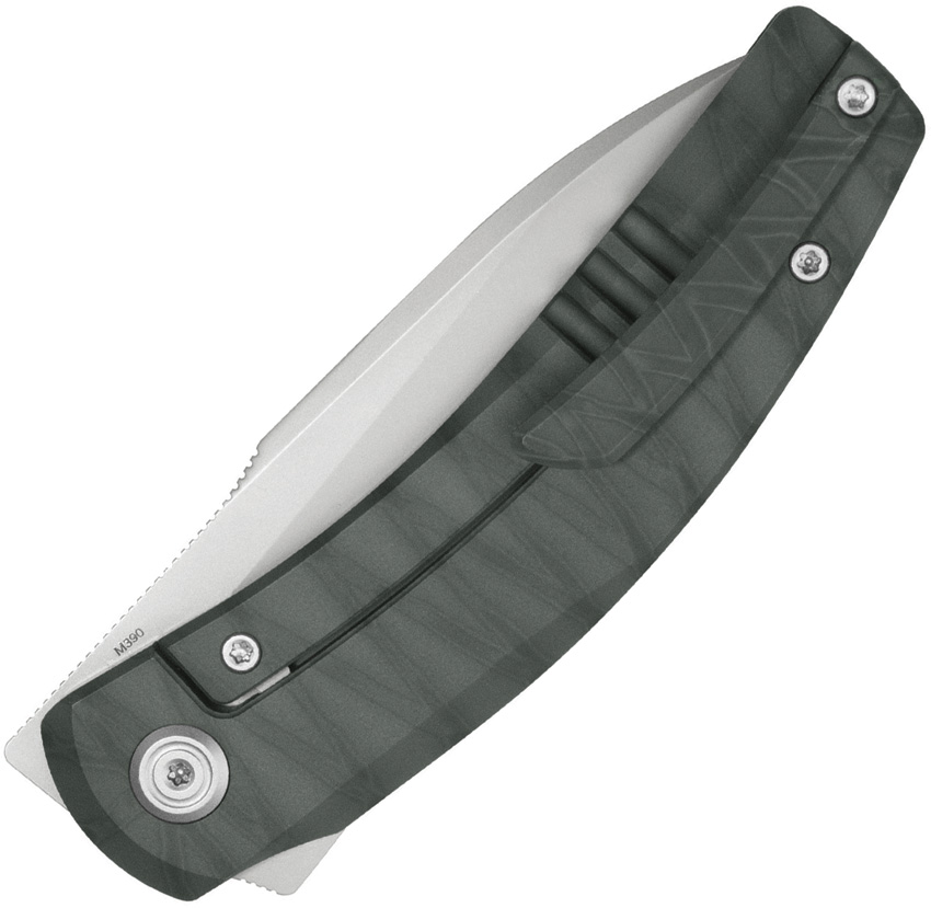 4.25″ (10.8cm) closed. 3.25″ (8.26cm) stonewash finish Bohler M390 stainless drop point blade. Flame anodized titanium handle. Extended tang. Pocket clip. Boxed.