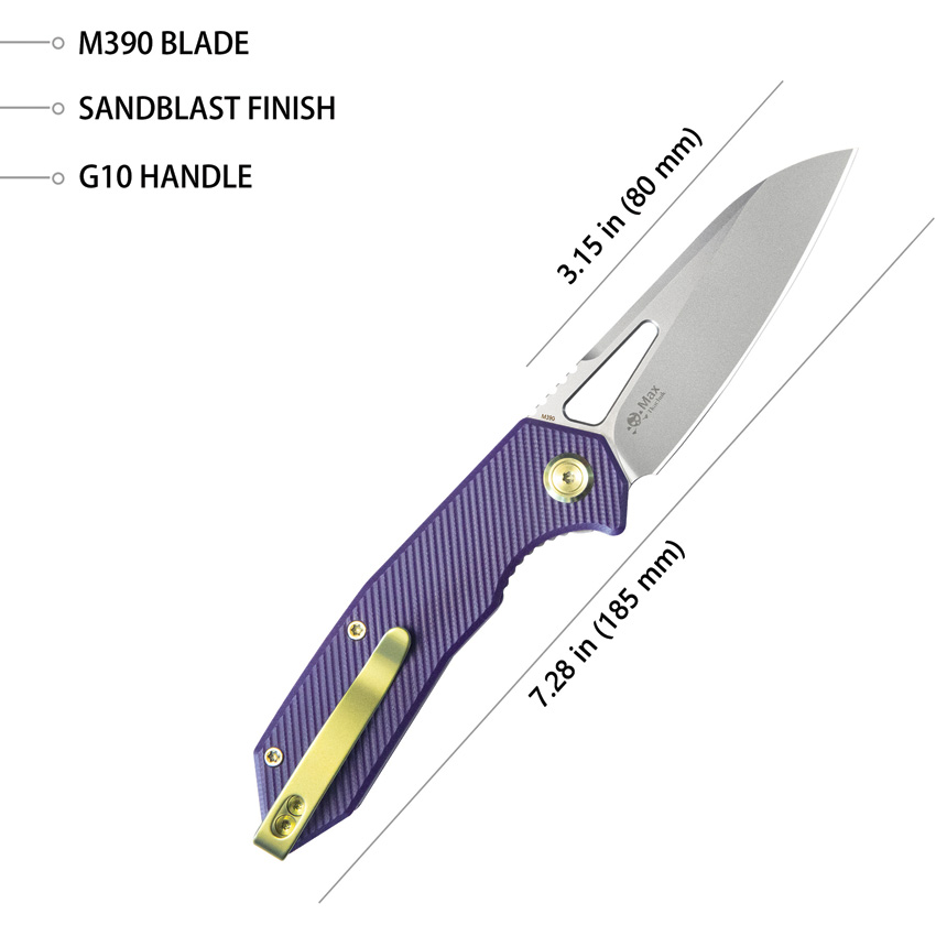4.13″ (10.49cm) closed. 3″ (7.62cm) sand blast finish Bohler M390 stainless blade. Purple G10 handle. Thumb pull. Pocket clip. Boxed.
