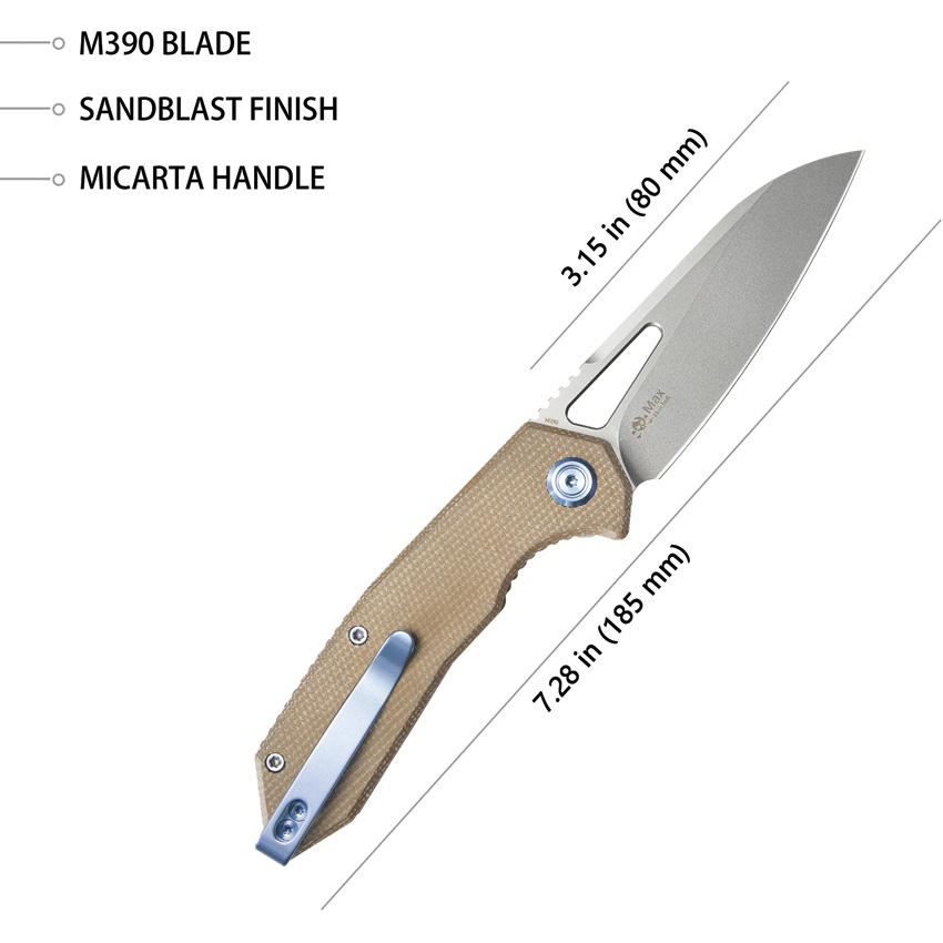 4.13″ (10.49cm) closed. 3″ (7.62cm) sand blast finish Bohler M390 stainless blade. Tan canvas micarta handle. Thumb pull. Pocket clip. Boxed.