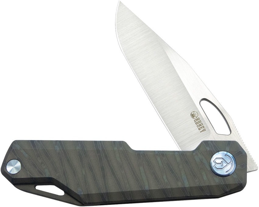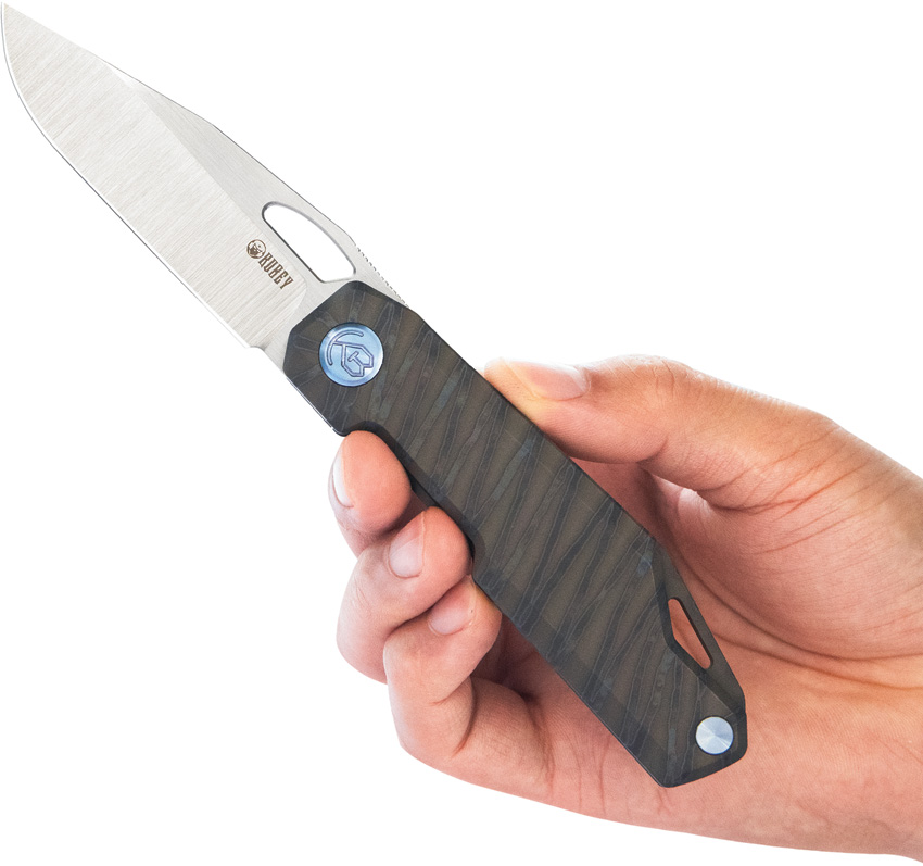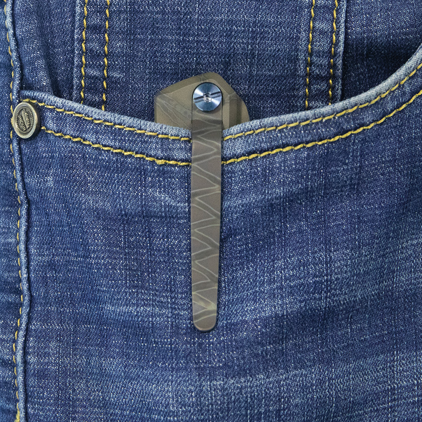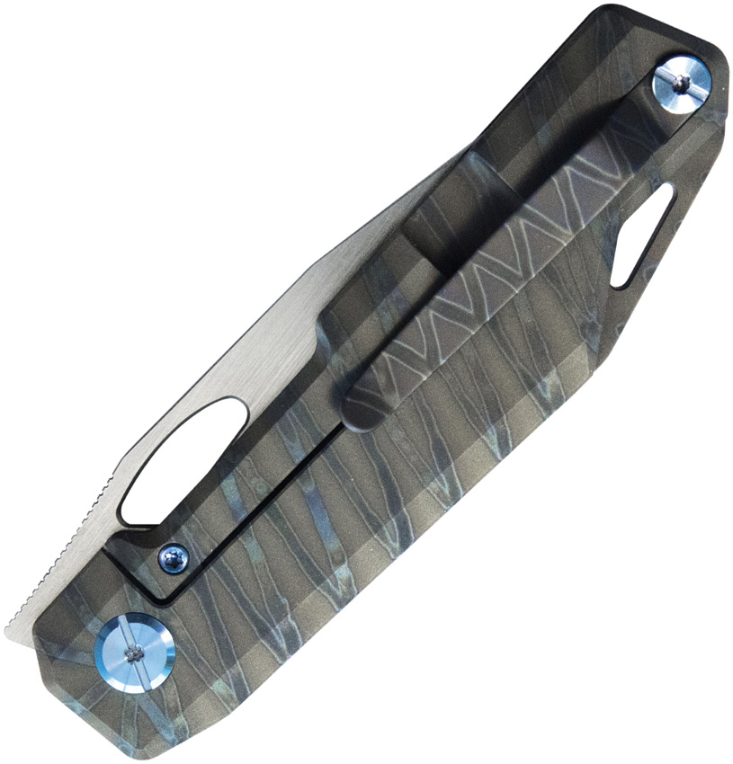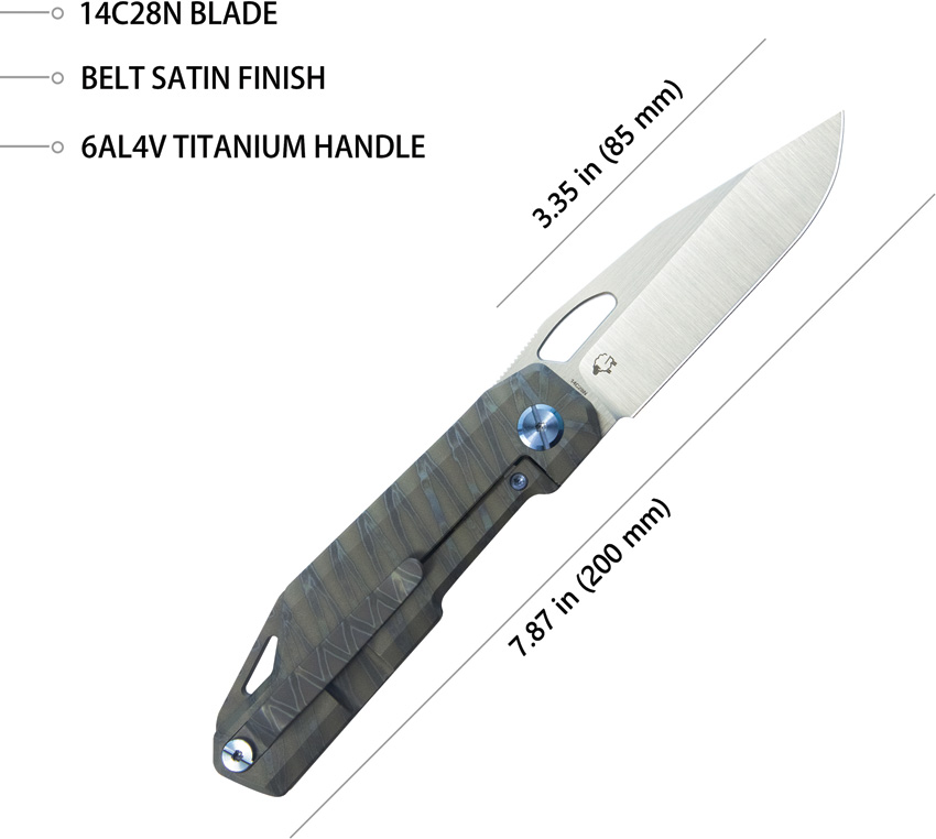 4.5″ (11.43cm) closed. 3.38″ (8.59cm) satin finish 14C28N Sandvik stainless blade. Gray flamed titanium handle. Extended tang. Lanyard hole. Pocket clip. Thumb pull. Boxed.