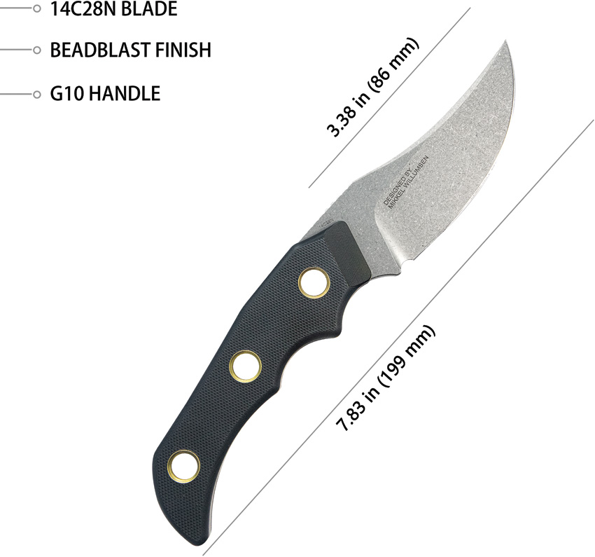 7.88″ (20.02cm) overall. 3.38″ (8.59cm) stonewash finish 14C28N Sandvik stainless clip point blade. Black G10 handle. Full tang. Lanyard hole. Black Kydex belt sheath. Boxed.
