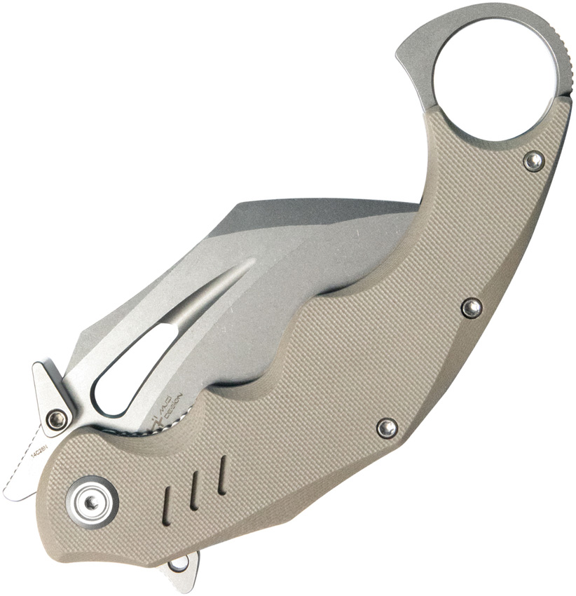 5.25″ (13.34cm) closed. 2.75″ (6.99cm) stonewash finish 14C28N Sandvik stainless karambit blade. Tan G10 handle. Extended tang. Finger ring. Pocket clip. Boxed.
