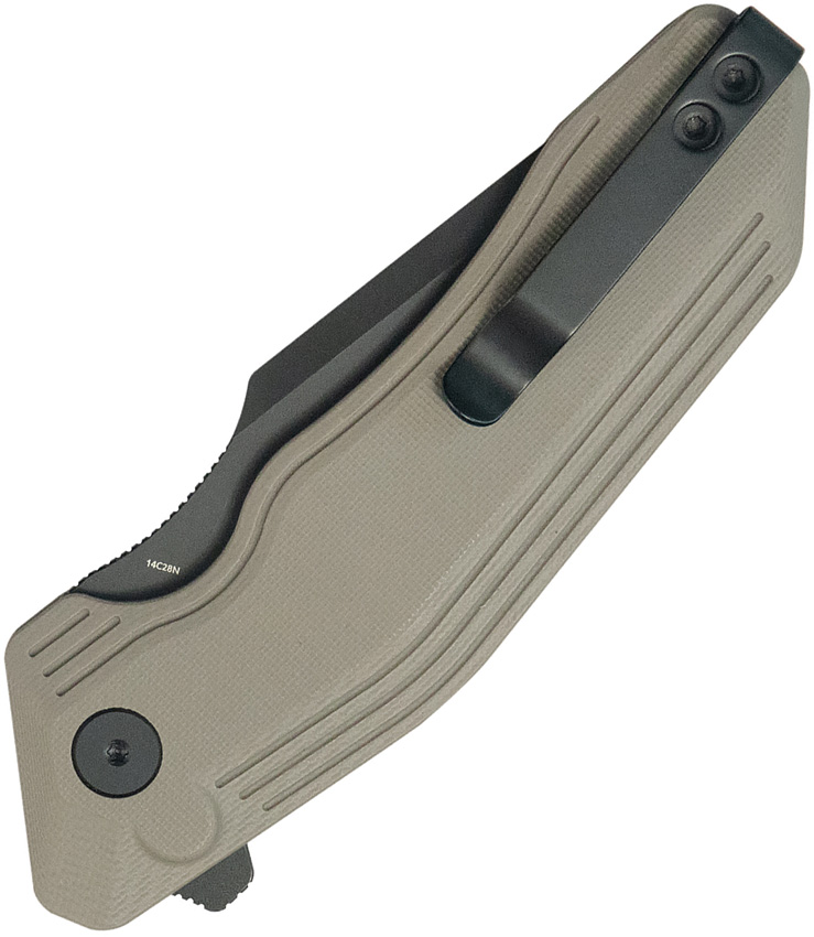 4.88″ (12.4cm) closed. 3.25″ (8.26cm) black stonewash finish 14C28N Sandvik stainless tanto blade. Tan G10 handle. Extended tang. Pocket clip. Boxed.