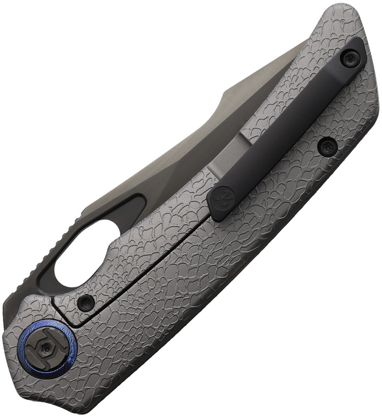 4.5″ (11.43cm) closed. 3.5″ (8.89cm) black DLC coated Vanax steel blade. Gray titanium handle with Timascus inlay. Thumb pull. Pocket clip. Honeydew texture handle. Boxed.