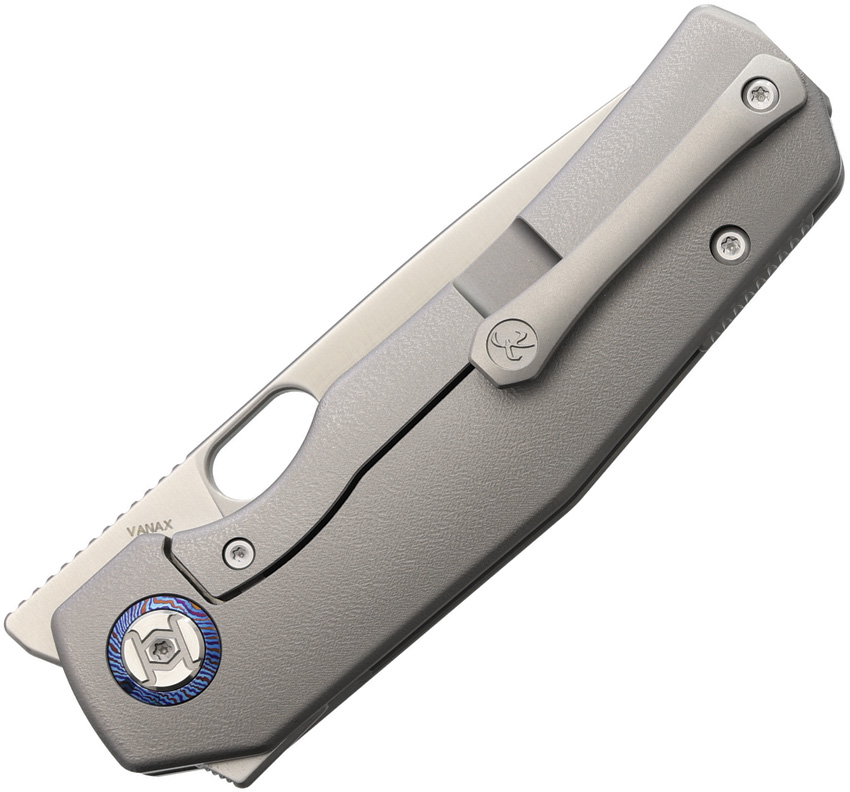 4.75″ (12.07cm) closed. 3.5″ (8.89cm) satin finish Vanax steel drop point blade. Orange peel titanium handle. Extended tang. Thumb pull. Pocket clip. Boxed.