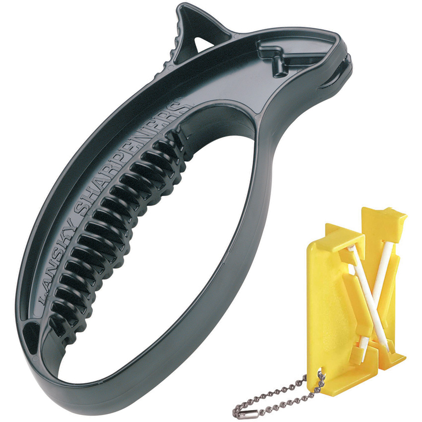Includes: Quick Edge knife sharpener; Mini Crock Stick sharpener. Quick Edge features replaceable Carbide Pull-Thru style sharpening element; Ergonomic Plastic molded housing; Finger guard and thumb rest; Right or Left handed use. Mini Crock Stick features two removable alumina ceramic sharpening rods that are easily repositioned for fish hook sharpening, or easy cleaning. Clam packed.