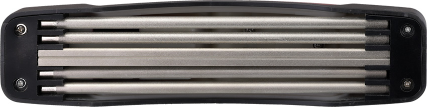 Dimensions: 10.75″ x 2.5″ x 2″. Grit: Medium l Fine. Non-slip base. Three preset rod angles (17, 20, 25). Medium (400 grit) and fine (600 grit) diamond rods. 3-radius diamond triangular rod which will sharpen all types of serrations as well as awls and fish hooks. Integrated hand guard. Easy snap-in rod storage. Each rod measures 9″. Assembled dimensions: 10.75″ x 9.5″ x 2″. Boxed with hanging tab.