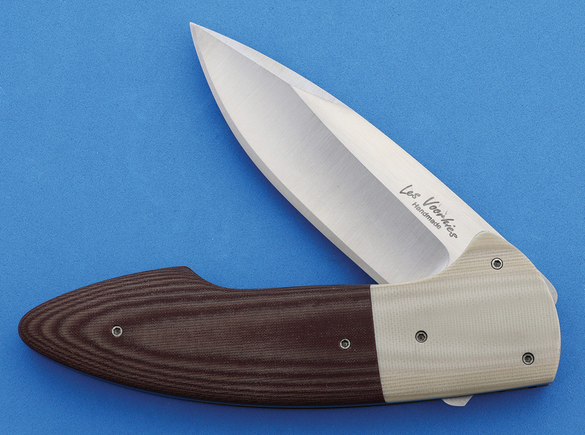 Les Voorhies Custom Tactical Folder. Quality maker from Fairbault, MN. 5 5/16” closed single blade linerlock. Satin finish spear point blade with flipper. Burgundy and crème color micarta handles with titanium liners. Comes in cordura zippered storage pouch.