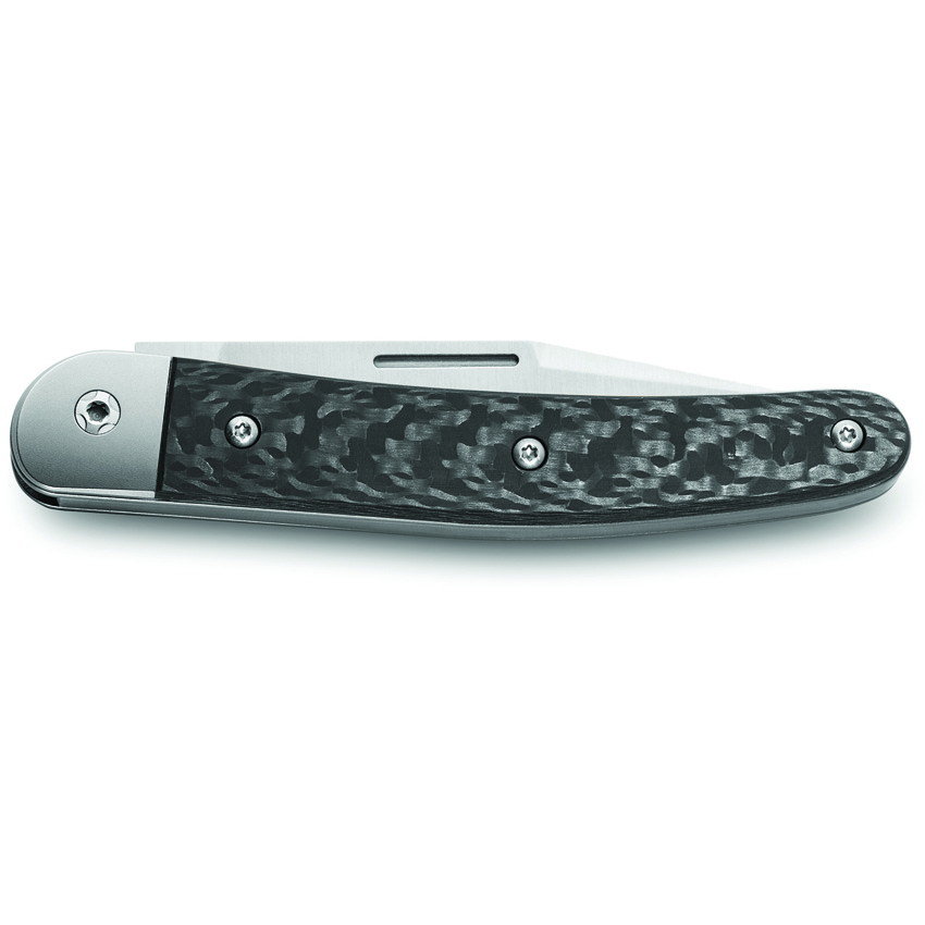 3.88″ (9.86cm) closed. Satin finish Bohler M390 stainless clip point blade. Carbon fiber handle. Titanium bolster(s). Boxed.