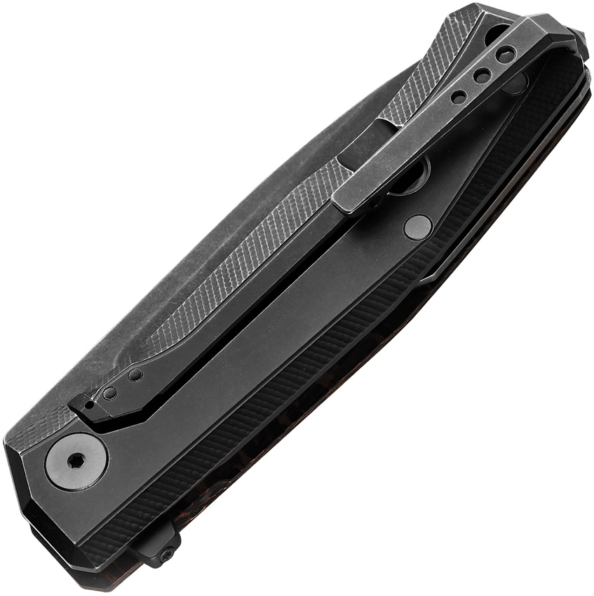 4.63″ (11.76cm) closed. 3.25″ (8.26cm) CPM MagnaCut stainless blade. Snakeskin Fat carbon fiber handle with black titanium back handle. Extended tang. Glass breaker. Lanyard hole. Pocket clip. Old black finish blade. Boxed.