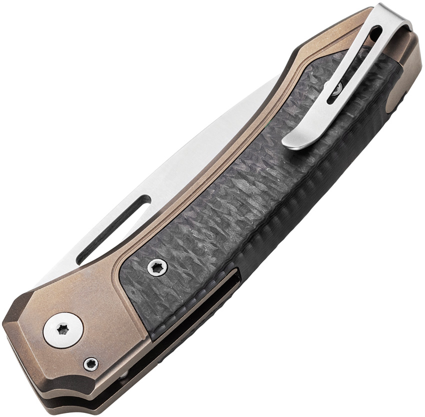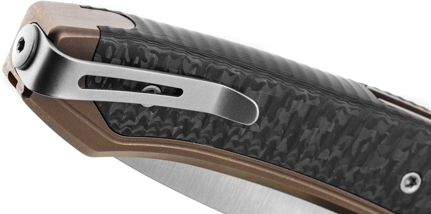 4.13″ (10.49cm) closed. 3.13″ (7.95cm) satin finish CPM MagnaCut stainless blade. Thumb pull. Lanyard hole. Pocket clip. Solid bronze titanium handle and solid carbon fiber handle. Boxed.