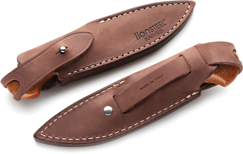 6″ (15.24cm) overall. 3.5″ (8.89cm) satin finish Bohler M390 stainless blade. Natural canvas micarta handle. Brown leather belt sheath. Boxed.