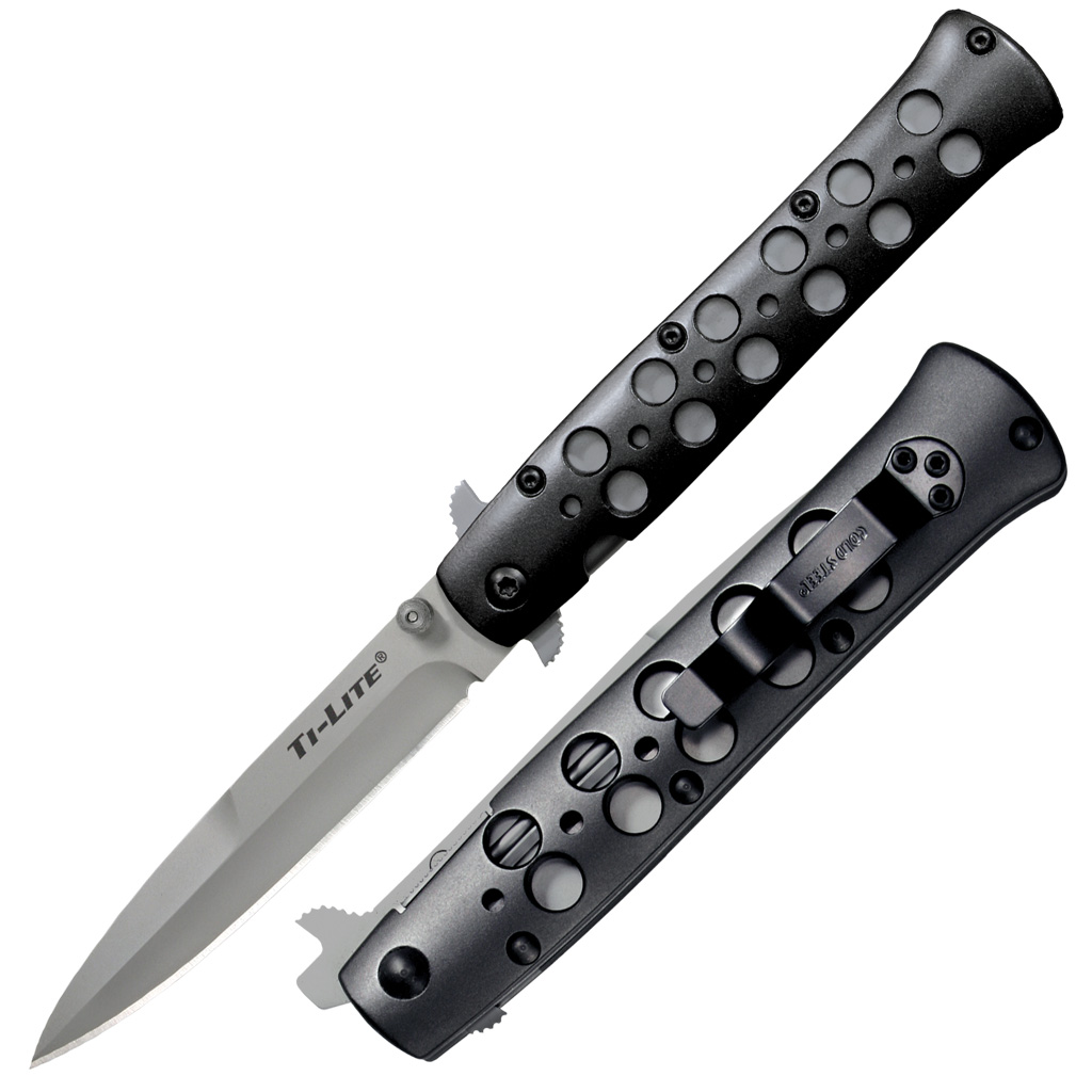 5″ (12.7cm) closed. 4″ (10.16cm) satin finish AUS-8 stainless spear point blade. Black aluminum handle. Extended tang. Thumb stud. Pocket clip. New. No Box. This Cold Steel item is from Lynn ThompsonÕs personal collection and comes with a Certificate of Authenticity signed by Lynn Thompson. Bagged.