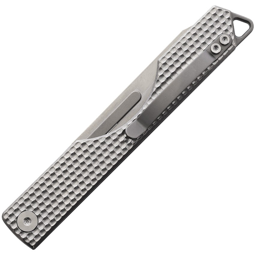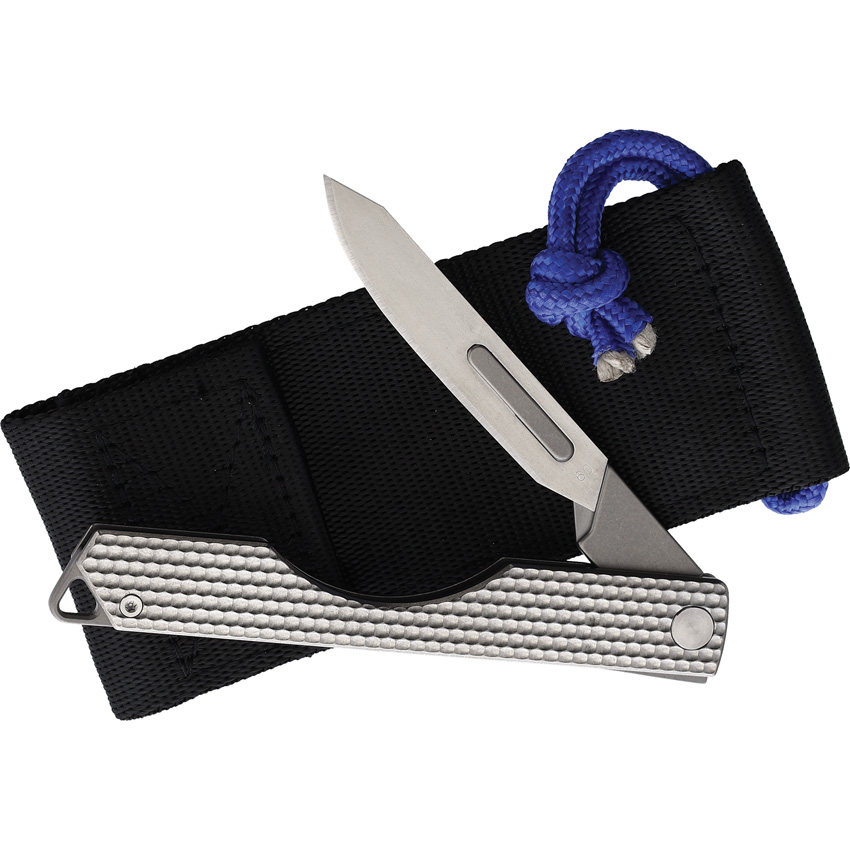 4.25″ (10.8cm) closed. Titanium handle. Lanyard hole. Comes with (8) stainless blades. Golf ball dimpled handle. Black nylon pouch. Bulk packed.