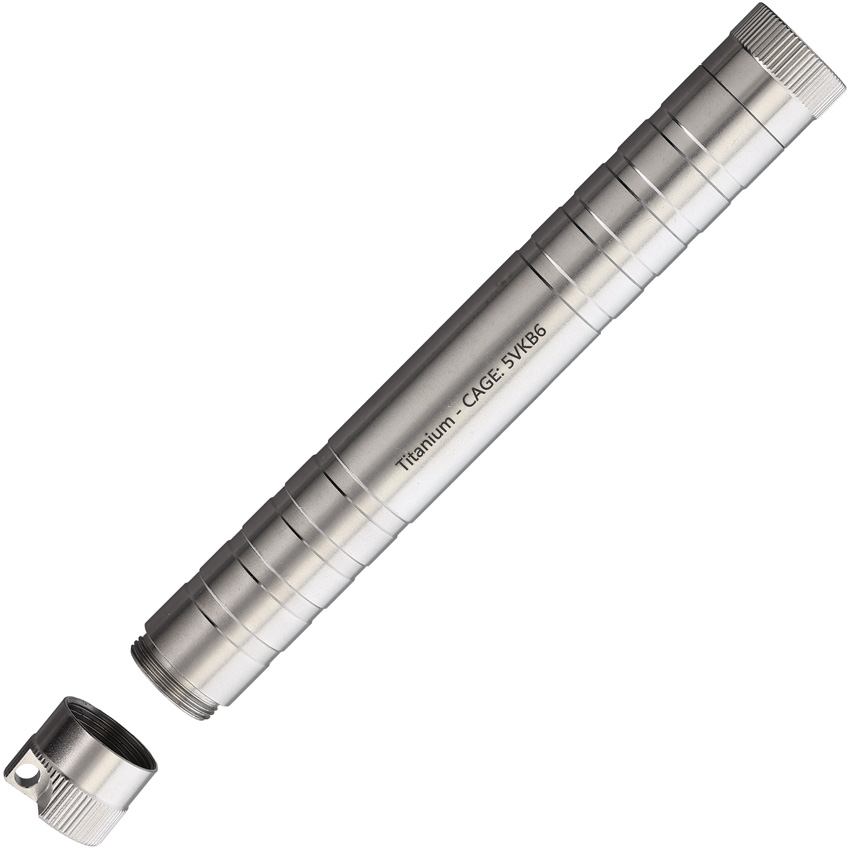 6.25″ overall. External diameter: 0.797″ (20mm). Internal opening: 0.582″ (14.8mm). Internal depth: 5.6″ (143mm). Lid is secured via flange to cap seal with internal O-ring. Can hold two AA batteries (not included). Comes in plastic tube. Titanium construction.