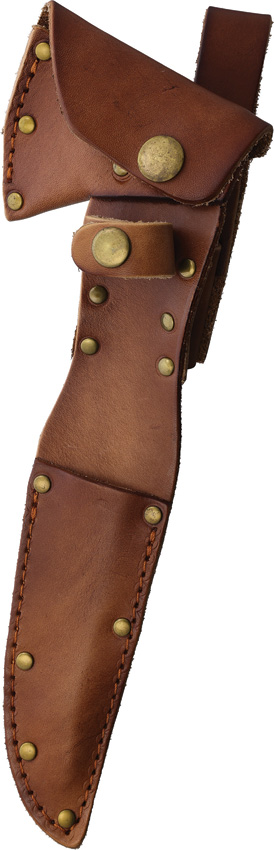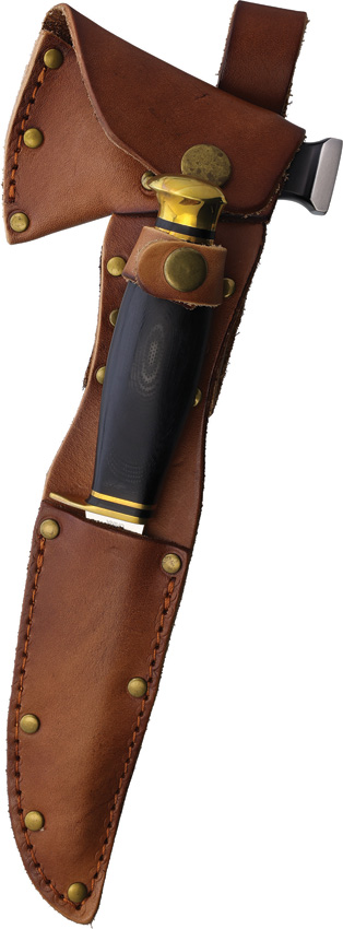 9″ overall. 3.5″ D2 tool steel axe head with 2″ cutting edge. Black micarta handle. Hammer end. Includes 8″ overall fixed blade with 4″ skinner blade. Brass guard and pommel. Brown leather belt sheath. Boxed.