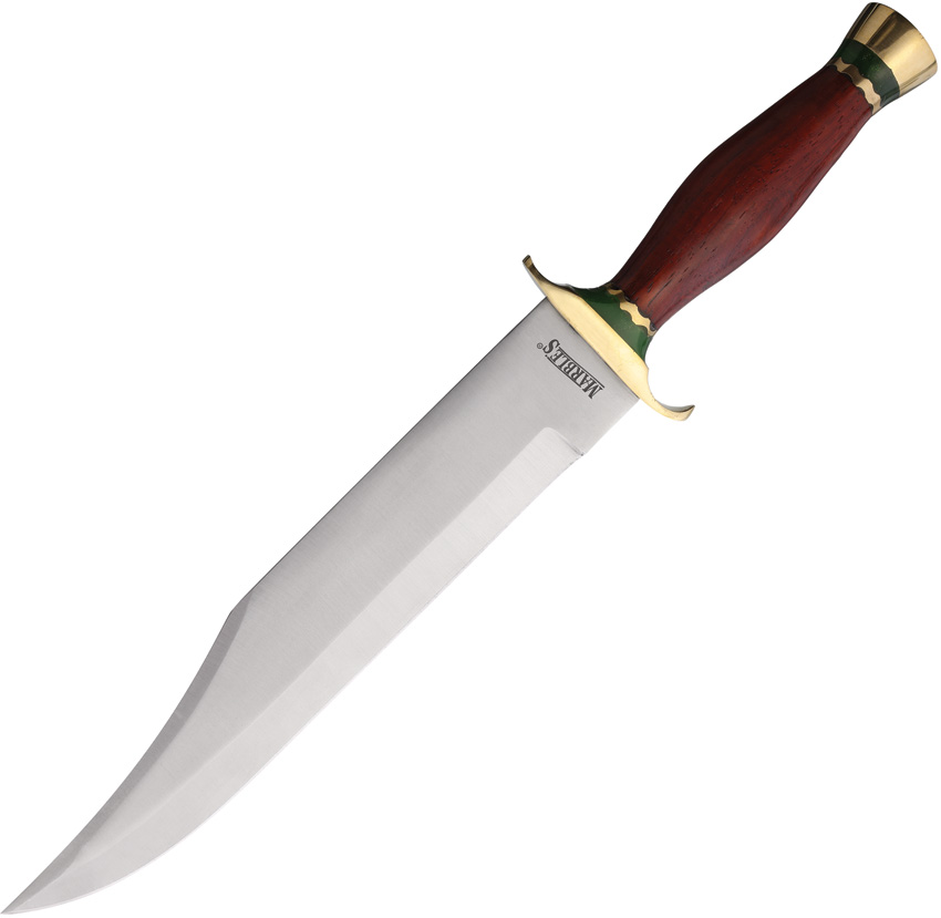 18″ (45.72cm) overall. 11.5″ (29.21cm) satin finish stainless blade. Brown wood handle. Brass guard and pommel. Green spacers. Brown leather belt sheath. Boxed.