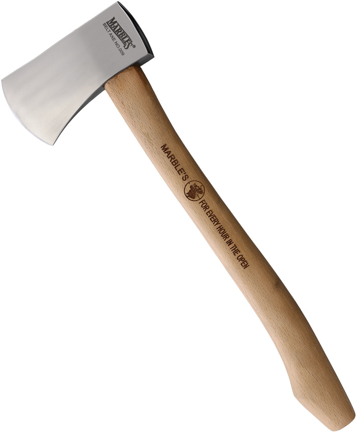 14″ overall. 4.63″ mirror finish stainless axe head with 2.5″ cutting edge. Hickory handle. Brown leather belt sheath. Boxed.