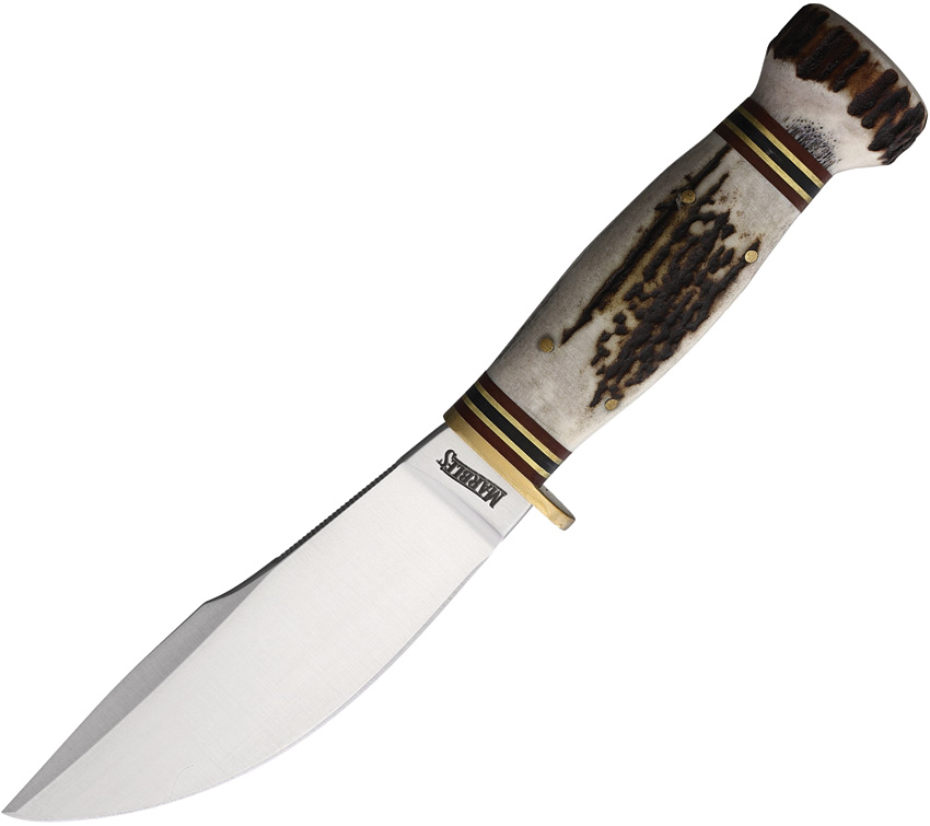 8.25″ (20.96cm) overall. 4.25″ (10.8cm) satin finish stainless blade. Stag handle. Brass guard and stag pommel. Brown leather belt sheath. Boxed.