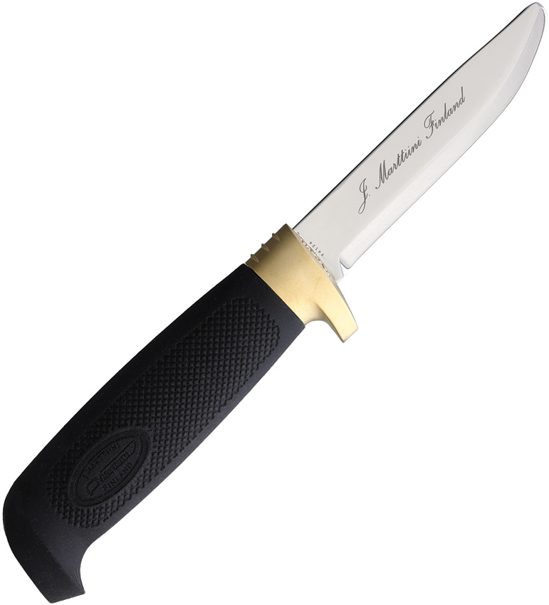 7.13″ (18.11cm) overall. 3.13″ (7.95cm) satin finish stainless blade. Black rubber handle. Rounded tip. Black leather belt sheath. Boxed with hanging tab.