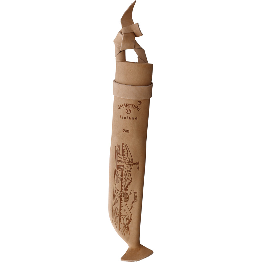 9.5″ (24.13cm) overall. 5″ (12.7cm) stainless blade. Curly Birch handle. Blade etching. Natural leather belt sheath. Boxed with hanging tab.